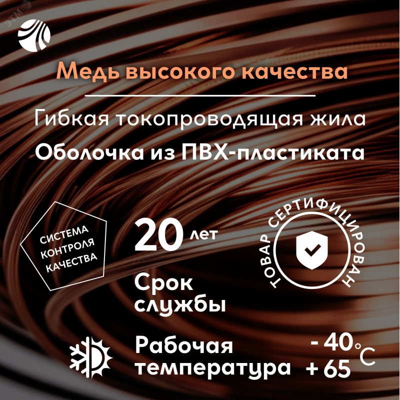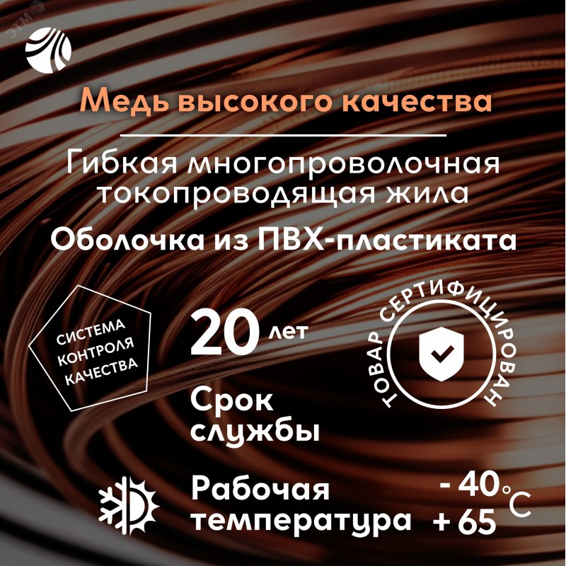 - Материал изоляции:ПВХ пластикат пониженной пожароопасности с низким дымо-газовыделением
