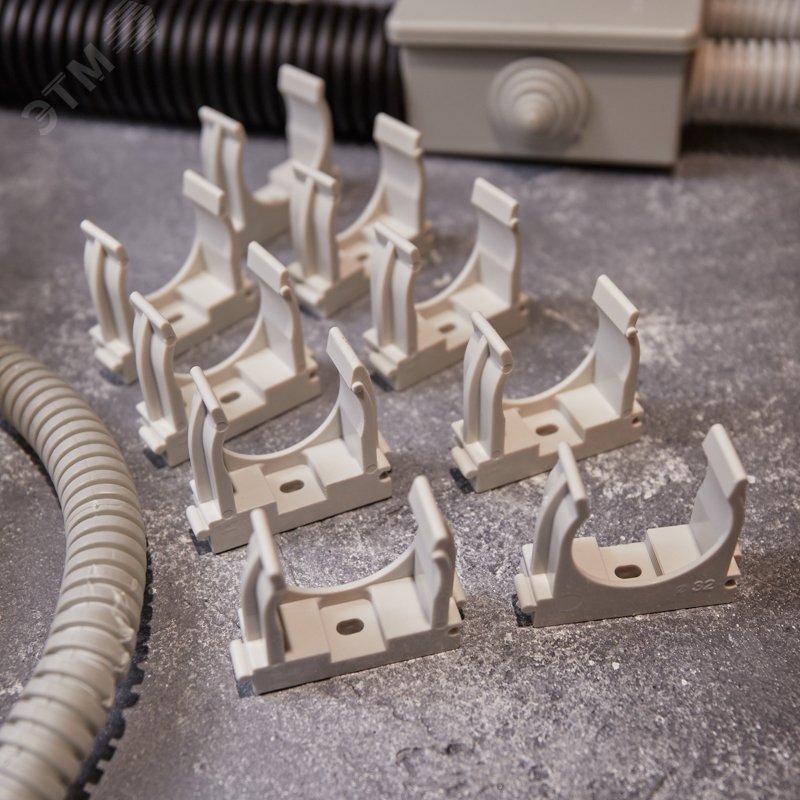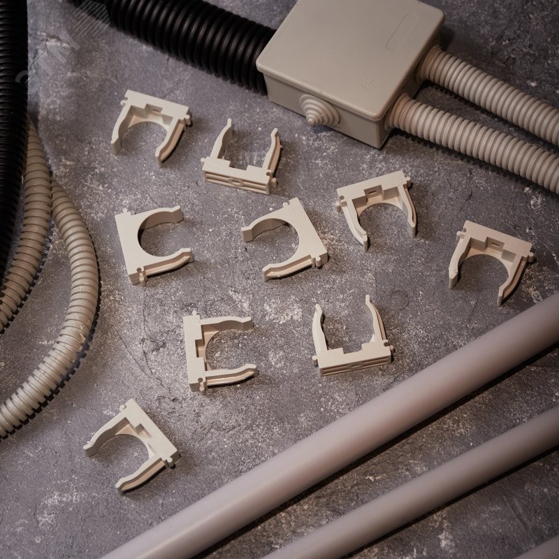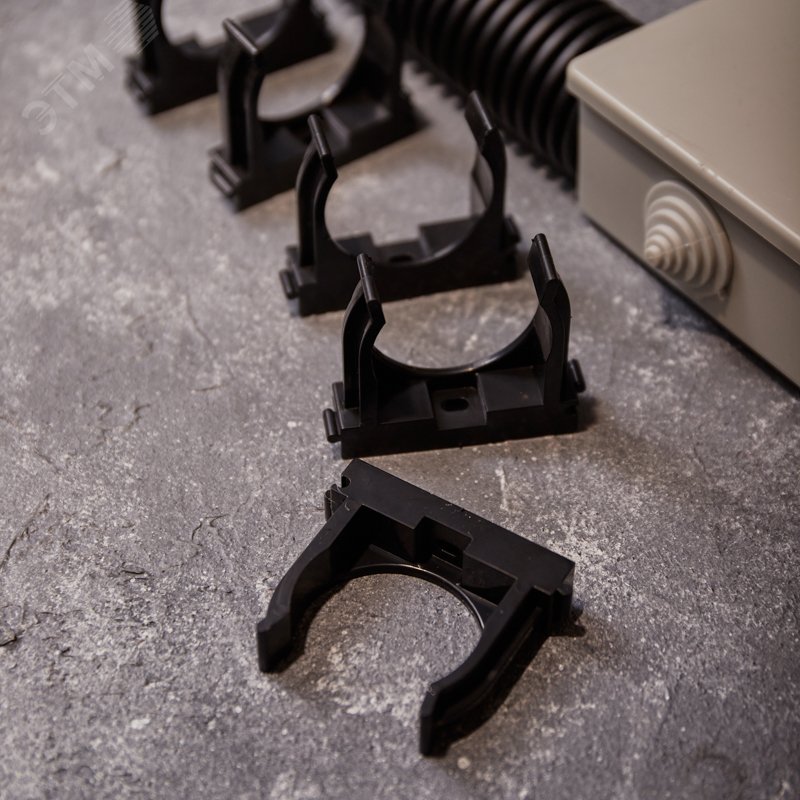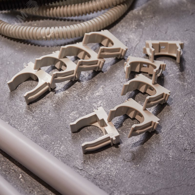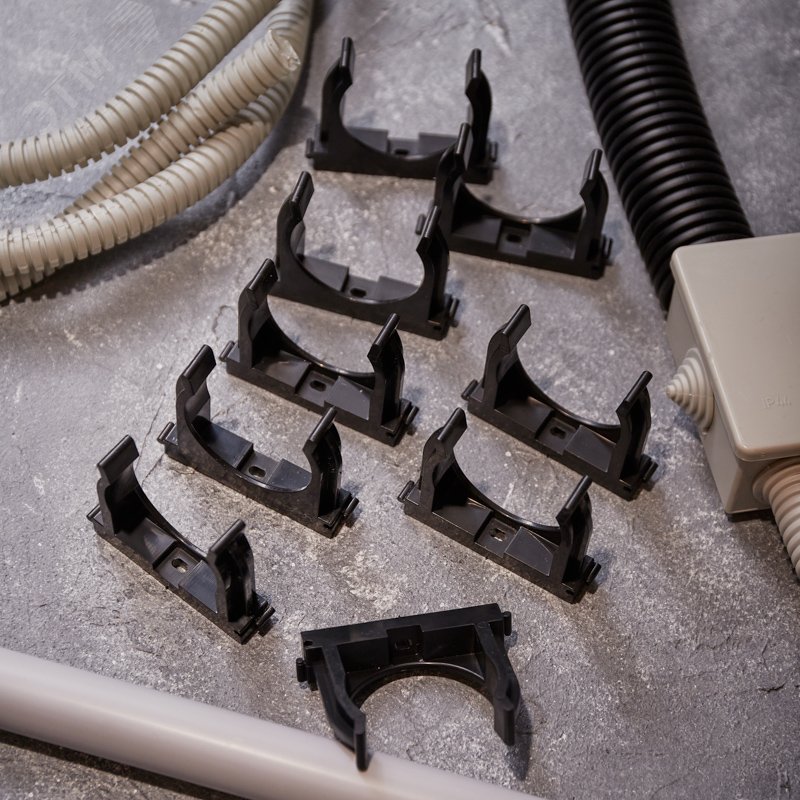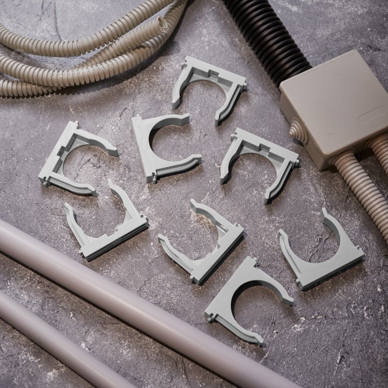 Используется для крепления гофрированных и гладких труб к поверхности стен или потолка. Для крепления к поверхности в крепёж-клипсе предусмотрено технологическое отверстие под саморез или дюбель.