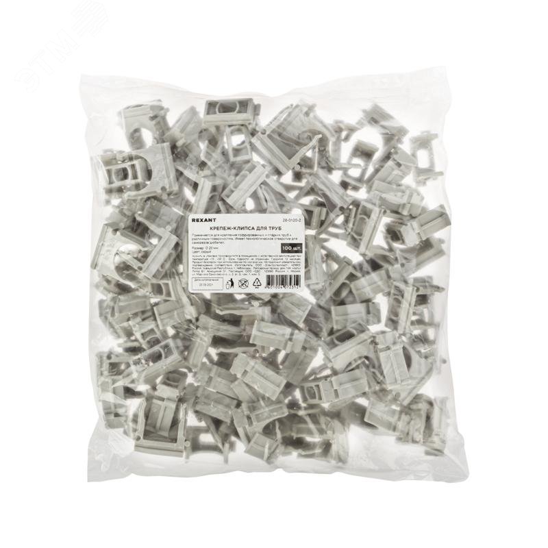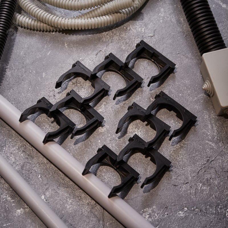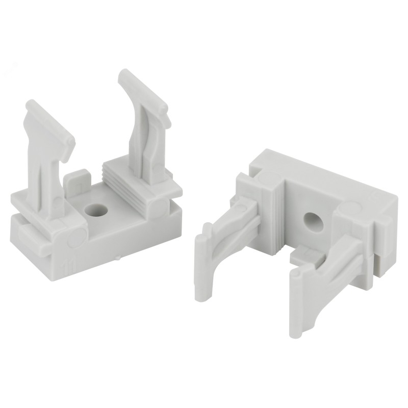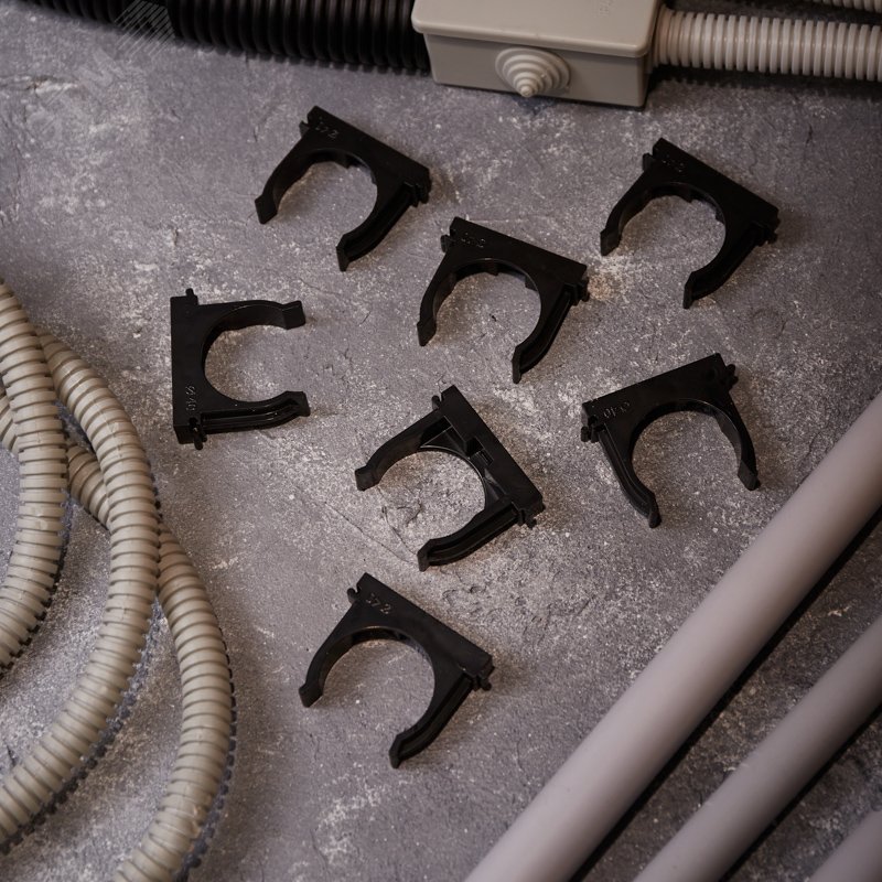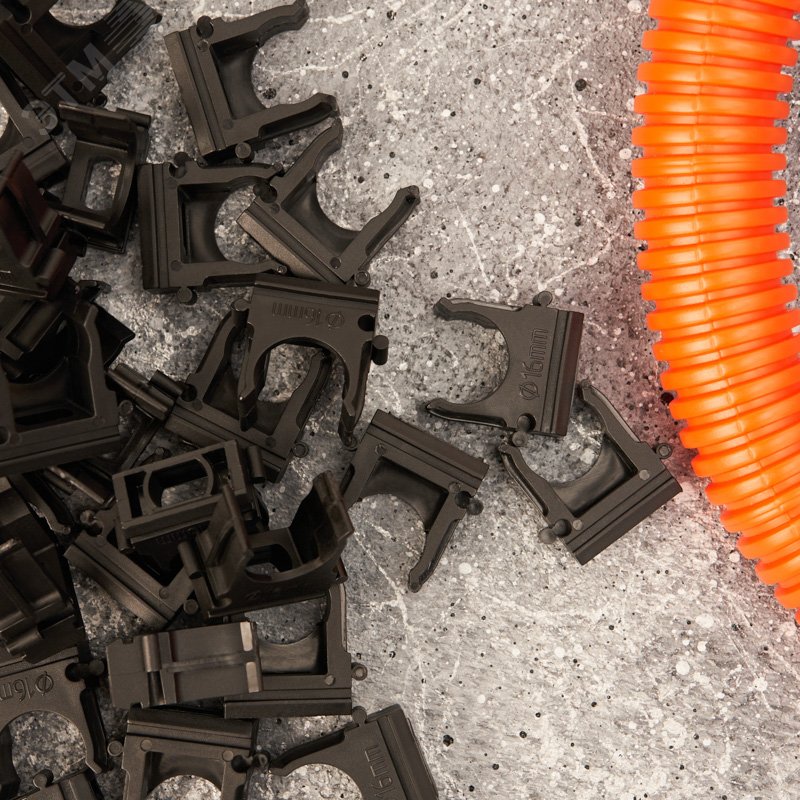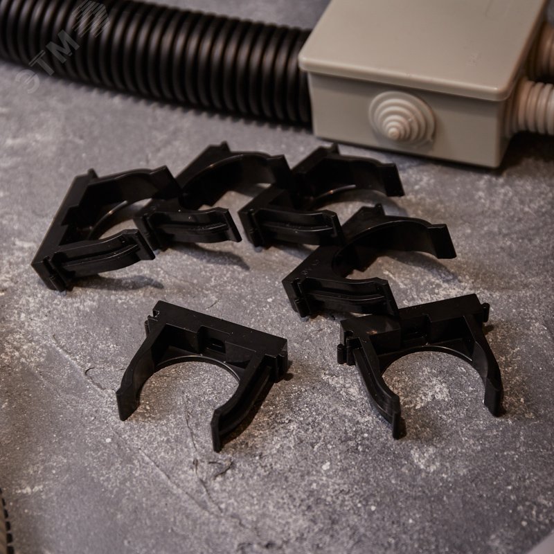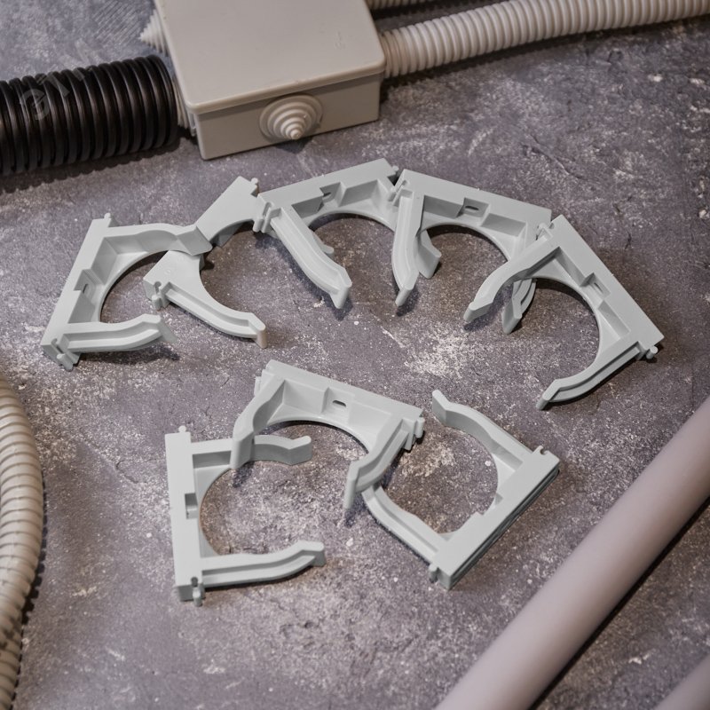 Используется для крепления гофрированных и гладких труб к поверхности стен или потолка. Для крепления к поверхности в крепёж-клипсе предусмотрено технологическое отверстие под саморез или дюбель.