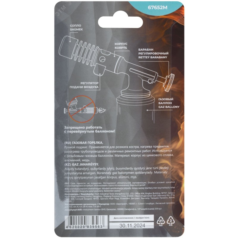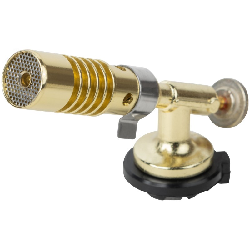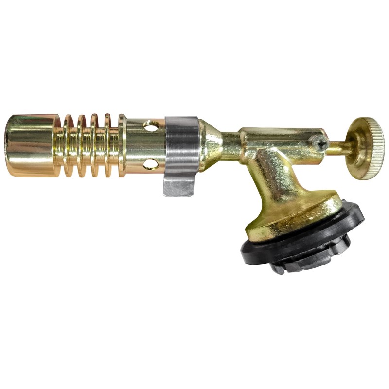 Ручной поджиг. Для розжига костра, разогрева трубопроводов, нагрева предметов и различных ремонтных работ. Используется с цанговым баллоном. Регулировка пламени и подачи воздуха, температура 1300 градусов Цельсия. Сопло диаметр 20 мм. Металлический корпус. Материал - корпус из цинкового сплава, алюминиевый сплав, медь. Упаковка - блистер.