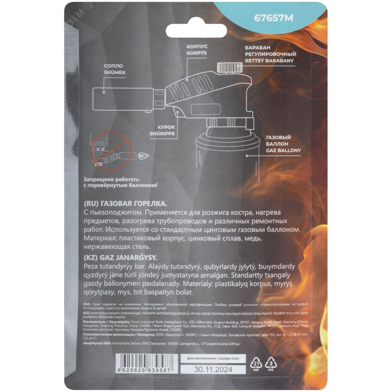 С пьезоподжигом. Для розжига костра, разогрева трубопроводов, нагрева предметов и различных ремонтных работ. Используется со стандартным цанговым газовым баллоном. Регулировка пламени, температура 1300 градусов Цельсия. Сопло диаметр 22 мм. Материал - пластиковый корпус, цинковый сплав, медь, нержавеющая сталь. Упаковка - блистер.