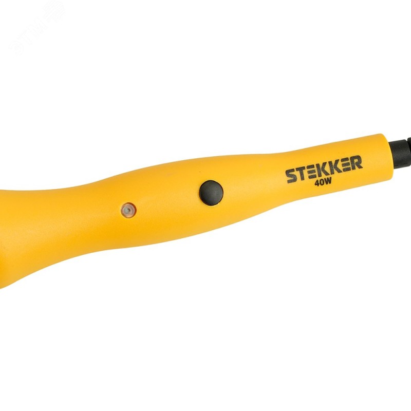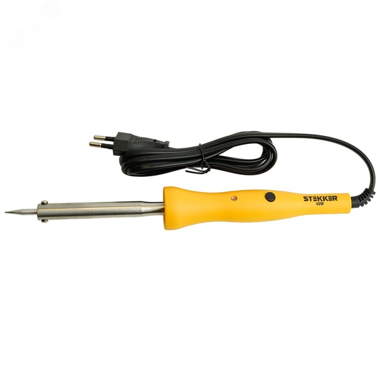 PLE201- 40 Паяльник 40W с кнопкой включения, нихромовый нагреватель, долговечное жало, 230В. Электрический нагревательный прибор, предназначенный для выполнения паяльных работ путем плавления специальных сплавов (припоев) и нанесения их на изделие. Паяльник имеет пластиковую ручку, съемное долговечное жало, неоновый индикатор и кнопку включения/выключения на рукоятке.