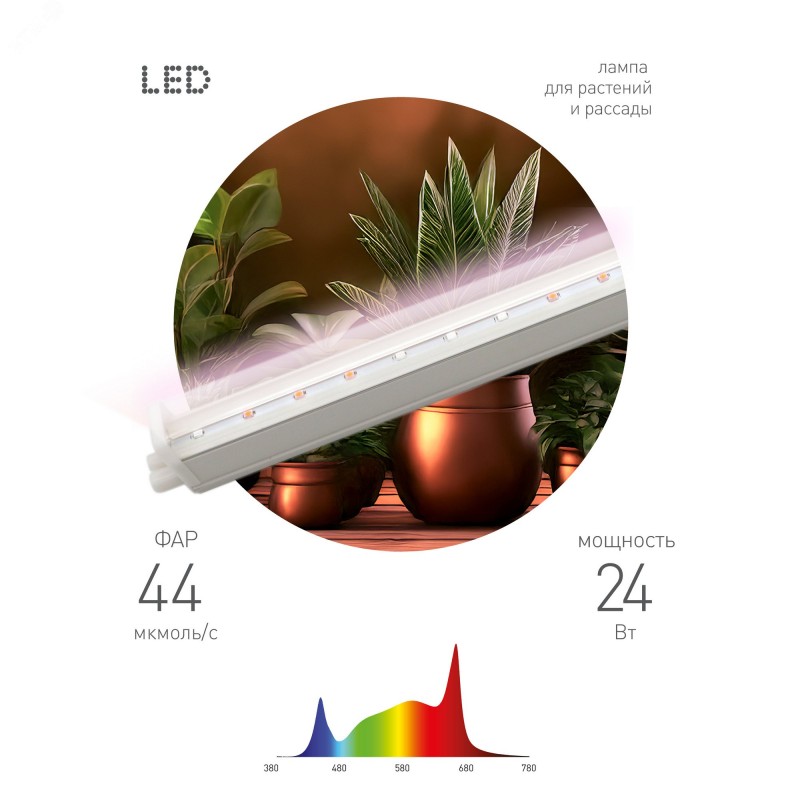 Мощная светодиодная линейная лампа мощностью 24 Вт – ваш секрет круглогодичного сада прямо у вас дома. Высокий индекс цветопередачи Ra90 имитирует естественный солнечный свет, пробуждая фотосинтез и стимулируя пышное цветение и здоровый рост. FITO-24W-Ra90 – это не только мощь, но и экономия. Инновационная светодиодная технология гарантирует минимальное энергопотребление и впечатляющий срок службы, позволяя вам наслаждаться красотой вашего зеленого уголка, не переживая о счетах за электричество. Установите фитолампу где угодно – над рассадой, любимыми комнатными цветами или в уютной домашней теплице. Её элегантный и лаконичный дизайн гармонично впишется в любой интерьер, добавляя нотку свежести и жизни.