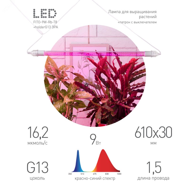 Линейный фито светильник FITO-9W-RB-Т8+holderG13, красно-синего спектра IP 65 c выключателем и вилкой позволит без дополнительных усилий подключить лампу T8 . Белый цвет удачно впишется в любой интерьер, а компактный размер не займет много места. 46 светодиодов с направленным фиолетовым светом ускоряют процесс фотосинтеза. Прозрачное светопроницаемое стекло эффективно воздействует на рассаду. Фитолампа рекомендована для эксплуатации в помещениях с естественным светом и обычными лампами 1200 К. Небольшие габариты: длина 60 см, диаметр колбы - 2,6см, длина шнура питания - 1,5 м позволяют разместить ее в комнате небольшой площади. Идеальна для вертикального выращивания. Площадь освещения составляет 0,7 м2. Линейный фито светильник FITO-9W-RB-Т8+holderG13 безопасен для человека. Коэффициент пульсаций в 5% снижает риск воздействия на глаза.