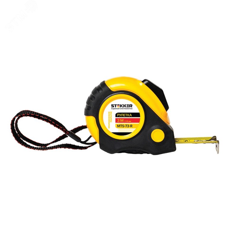 MTS-73-R Рулетка, прорезиненное покрытие, II класс точности, автостоп. Измерительный прибор для определения линейных размеров объекта. Размер: 3 м * 16 мм. Класс точности: II. Материал корпуса: ABS пластик, термопластичная резина. Материал полотна: высокоуглеродистая сталь. Цвет полотна: матовое полотно желтого цвета. Разметка на полотне: односторонняя. Зацеп с функцией захвата и отверстием для того чтобы зацепить шуруп или гвоздь, так же имеется функция автостоп. Доп: на задней части рулетки находится металлическая клипса для фиксации на поясе, сбоку ремешок-держатель выполнен из нейлона.