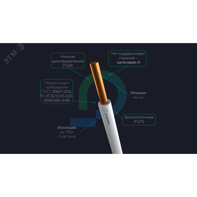 - Материал изоляции:ПВХ пластикат пониженной пожароопасности с низким дымо-газовыделением
