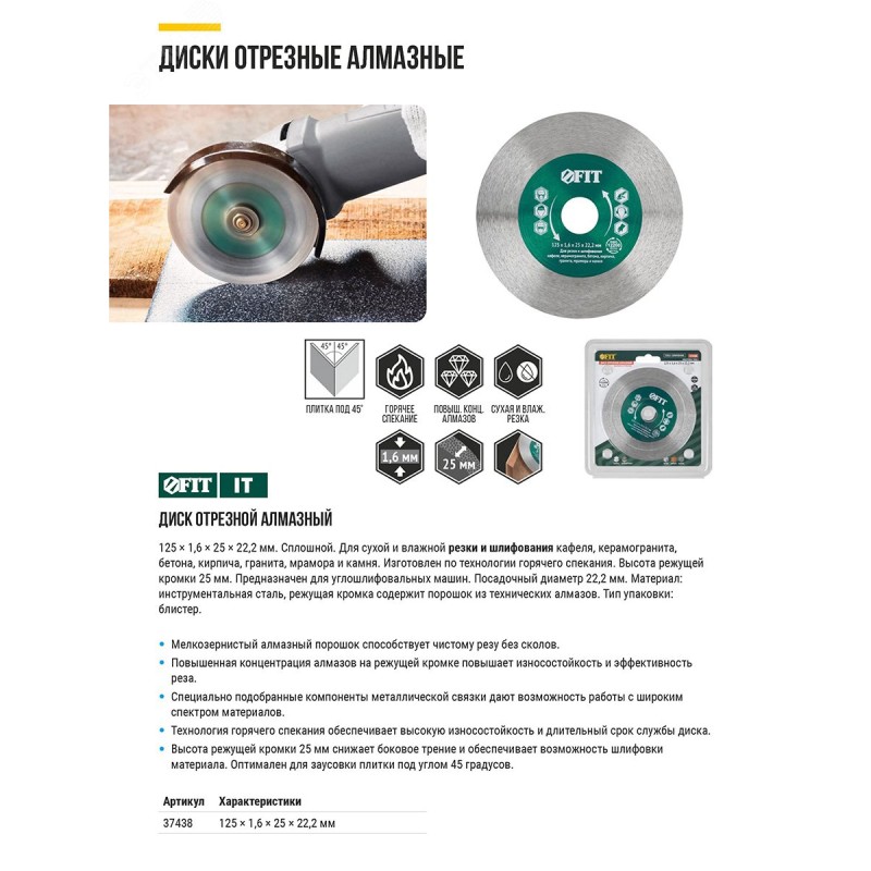 Для углошлифовальных машин. Применяется для сухой и влажной резки и шлифования кафеля, керамогранита, бетона, кирпича, гранита, мрамора и камня. Технология горячего спекания повышает прочность диска и его износостойкость. Повышенная концентрация алмазов на рабочей кромке обеспечивает высокий ресурс. Мелкозернистый алмазный порошок и сплошная режущая кромка способствуют чистому резу без сколов.