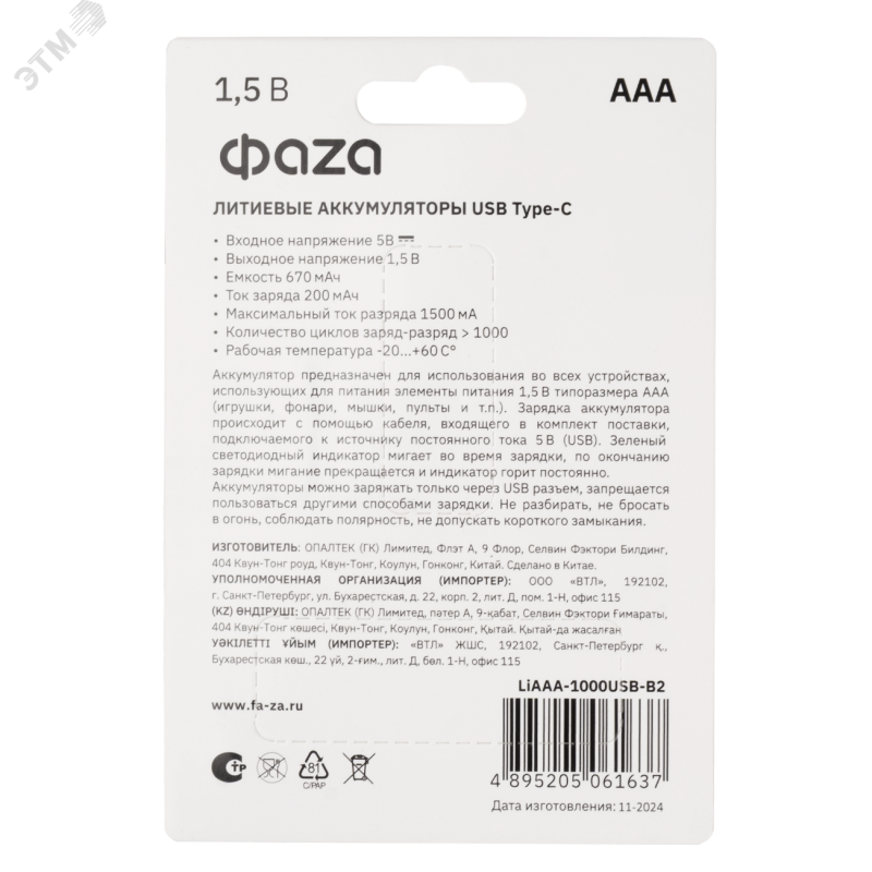 - Тип элемента питания:ААА