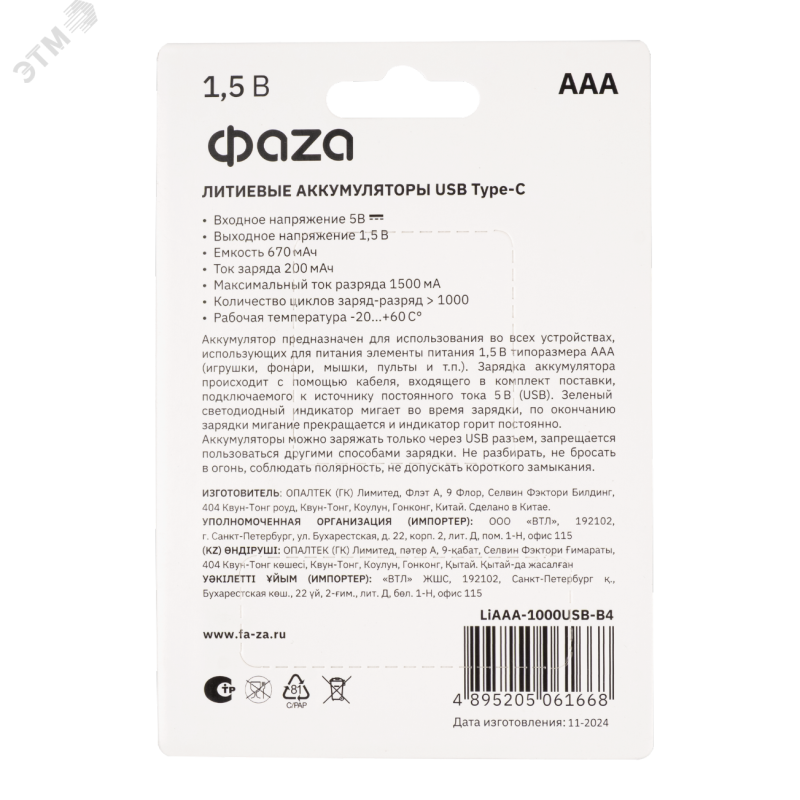 Литиевый аккумулятор напряжением 1,5В удобен для использования, так как не требует зарядное устройство. Разъем USB Type-C встроен в корпус аккумулятора. Для зарядки аккумуляторов достаточно подсоединить аккумуляторы к стандартному USB разъему через кабель для зарядки USB-A -> 2 х USB-C, который входит в комплект поставки. Кабель позволяет заряжать одновременно 2 аккумулятора. Быстрая зарядка менее 2 часов, без эффекта памяти, более 1000 циклов заряд-разряд, светодиодный индикатор заряда (перестает мигать при окончании заряда). Удобный легкий комплект в дорогу.