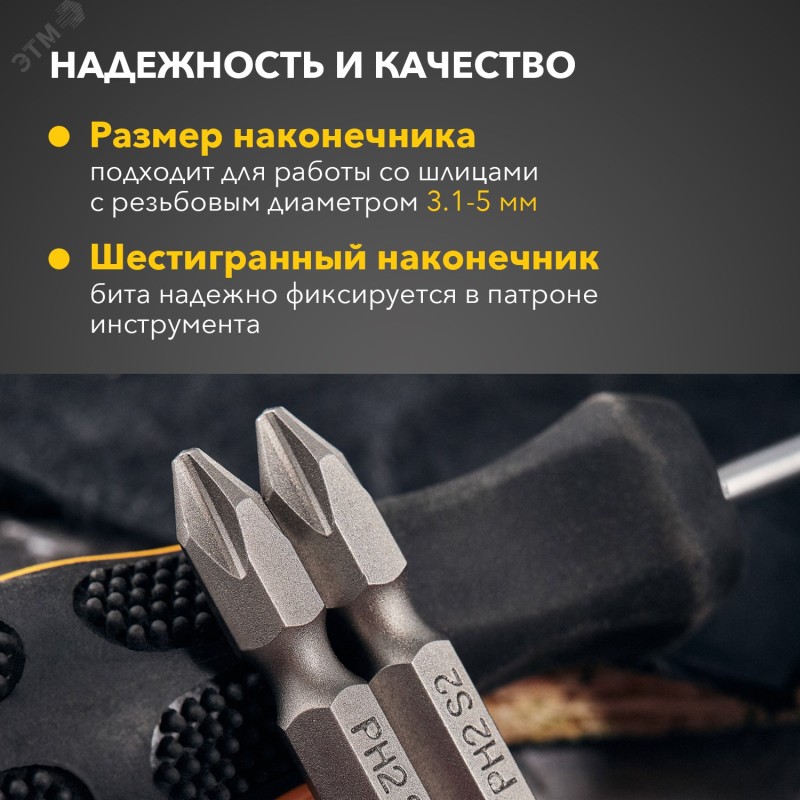 - Преимущества:Бита изготовлена из стали S2|Улучшенная форма биты, эффективная передача вращения крепежу|Улучшенная магнитность биты для более удобной работы с саморезами и другими шурупами|Повышенная твердость стали - высокий ресурс биты