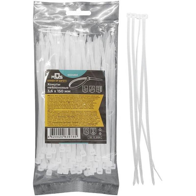 Белые. 100 шт. Предназначены для соединения и фиксации проводов, кабелей, труб и других конструкций. Монтаж может осуществляться как вручную, так и с использованием специального пистолета. Замок имеет ступенчатую фиксацию с блокировкой обратного хода. Материал - нейлон. Упаковка - п/э пакет с подвесом.