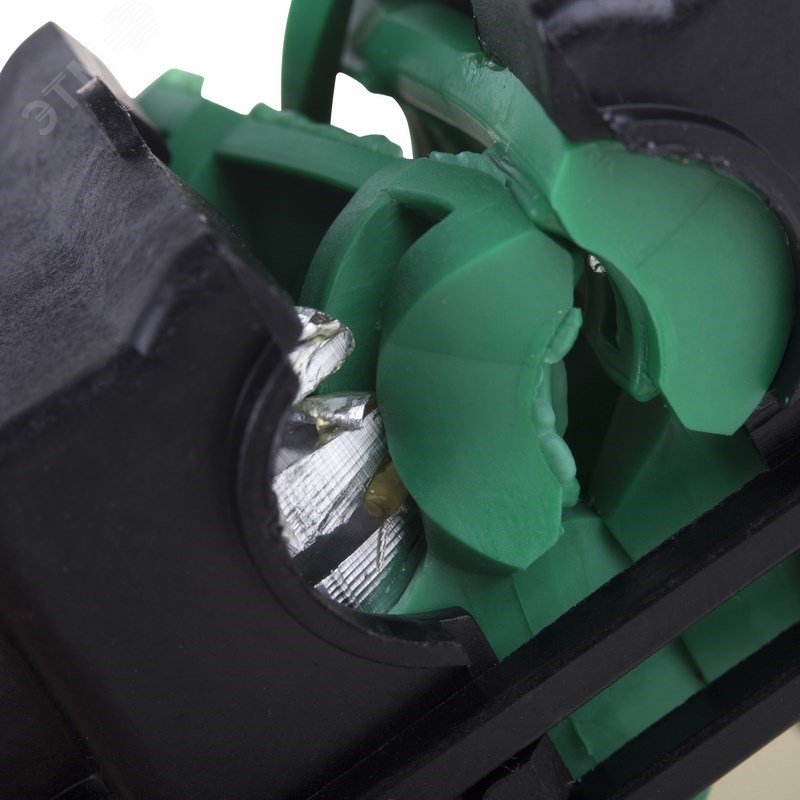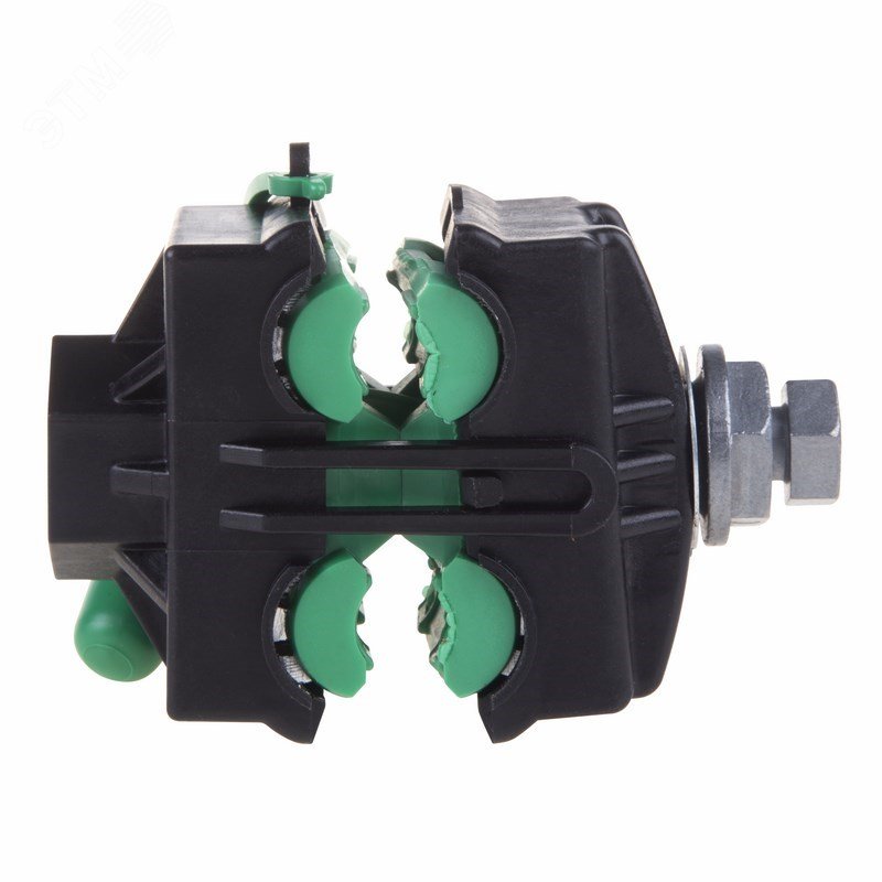 Предназначен для соединения и ответвления фазных и нулевых жил СИП, а также для ответвления абонентских проводников (проводов освещения). Нижняя планка для фиксации зажима при затяжке болта. Срывная металлическая головка из алюминиевого сплава. Корпус зажима сделан из армированного композиционного диэлектрического пластика, устойчивого к ультрафиолетовому излучению. Герметичность обеспечена специальным атмосферо- и ультрафиолетостойким эластомером. Не требуется специальных ключей. Допускается монтаж при температуре окружающего воздуха до -25 С. Изоляция испытана напряжением 6 кВ.