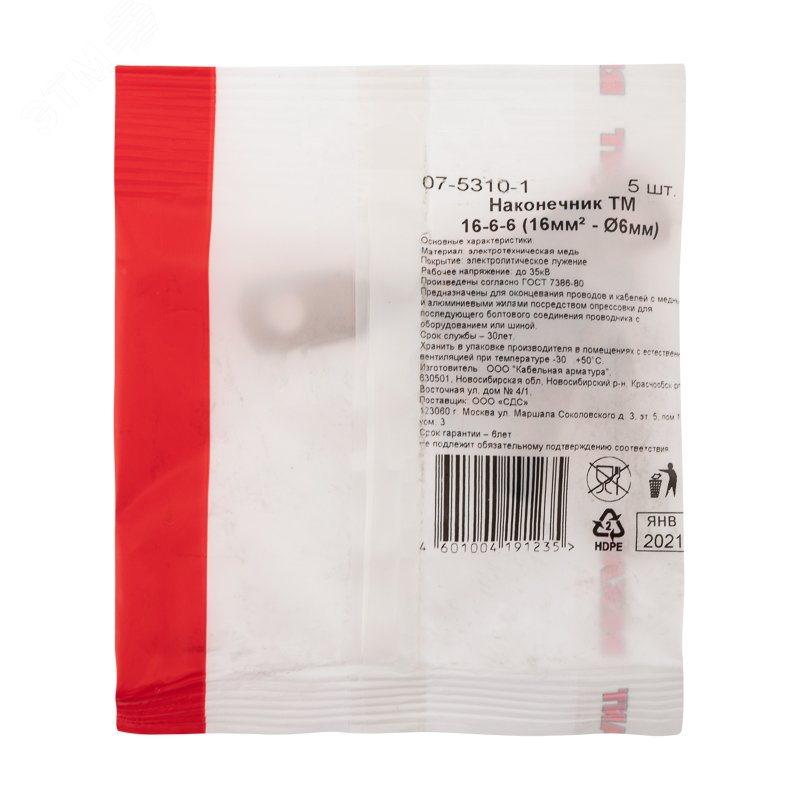 Наконечник ТМ REXANT предназначен для оконцевания опрессовкой медных кабелей и проводов. Выполнен из высококачественной меди. Структура обозначения - Т - Труба - полуфабрикат, из которого изготовлен наконечник. М - Медь - материал, из которого изготовлен наконечник. 16 - номинальное сечение наконечника, мм.кв. 6 - диаметр контактного стержня, мм. 6 - внутренний диаметр хвостовика, мм.