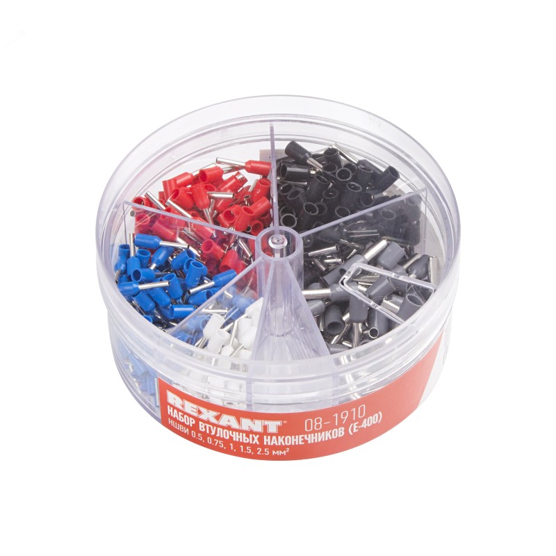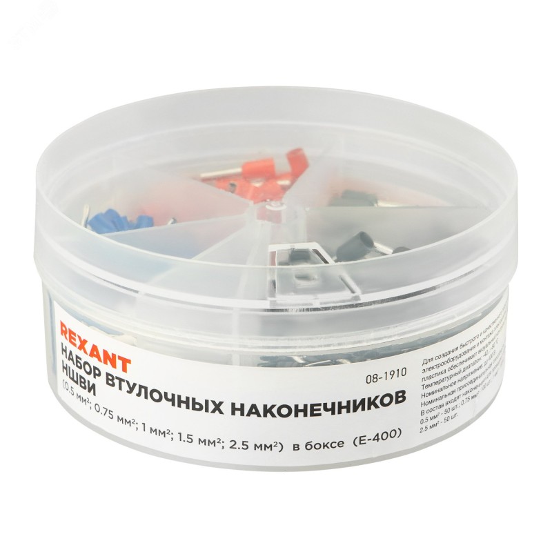 Температурный диапазон – -10...+75 градусов. В состав входят наконечники для проводов с сечением – 0.5 мм2, 50 шт., 0.75 мм2, 100 шт., 1 мм2, 100 шт., 1.5 мм2, 100 шт., 2.5 мм2, 50 шт.