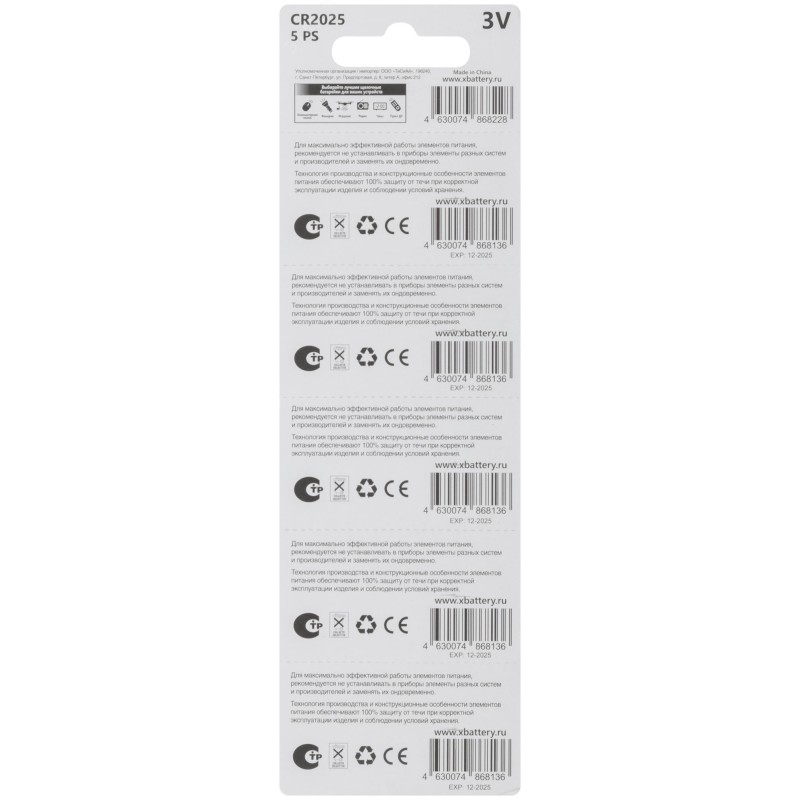 Элемент питания литиевый, 3 V, ''Таблетка'' , 5 шт.