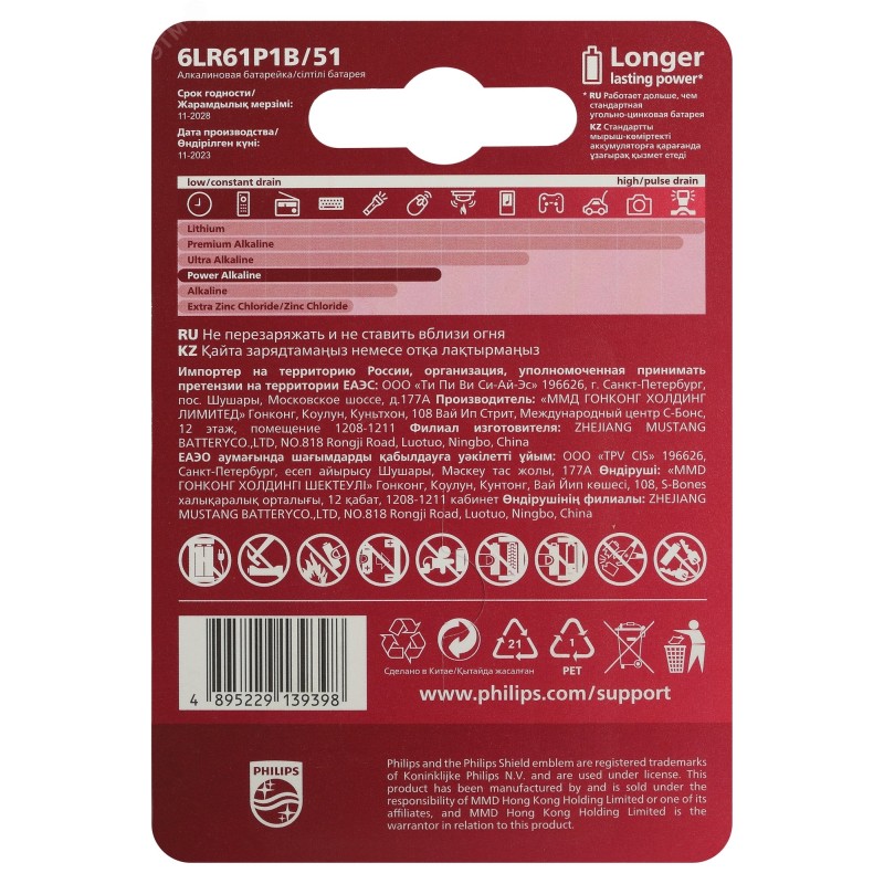 - Преимущества:Отлично подходит для устройств с высоким энергопотреблением|Цветная маркировка облегчает определение размеров элементов питания|Понятные схематические инструкции по эксплуатации|Не наносит вреда окружающей среде|Щелочные батарейки Philips не содержат кадмий, ртуть и свинец|Сохраняет заряд до 10 лет