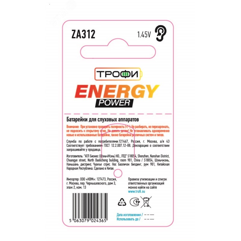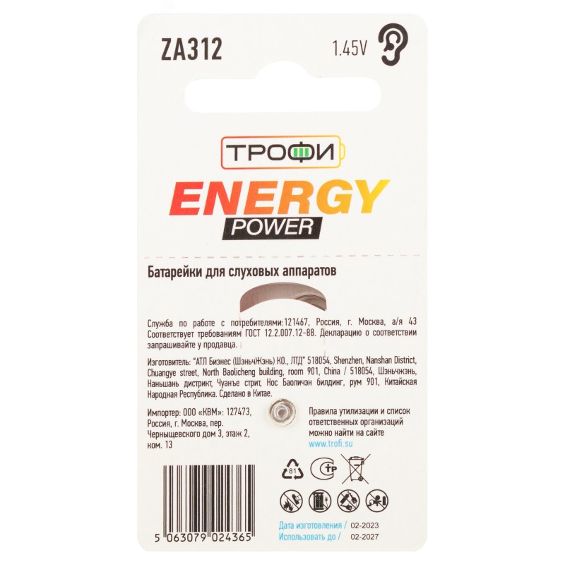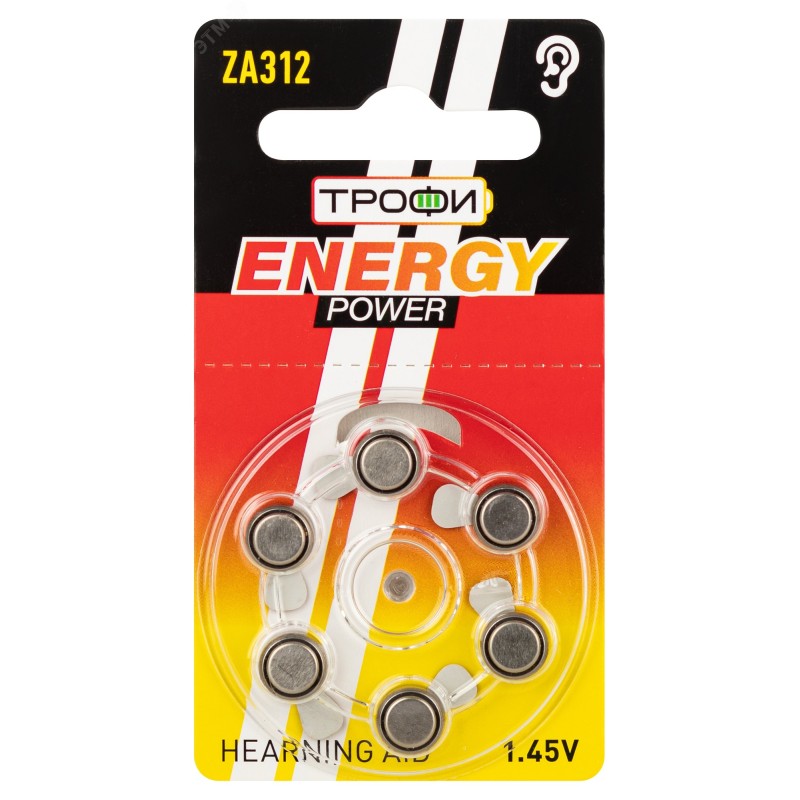 Элемент питания ZA312-6BL ENERGY POWER Hearing Aid Трофи