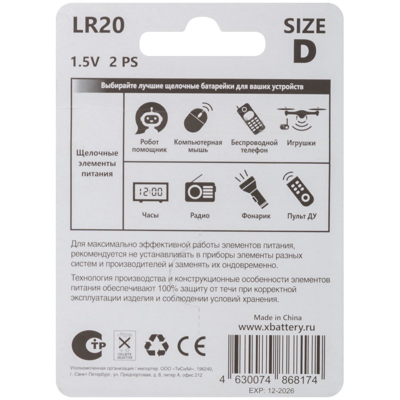 Элемент питания щелочной, 1,5 V, тип D, 2 шт.