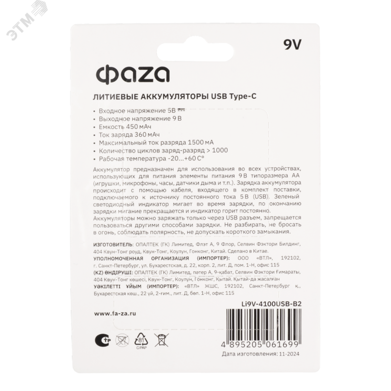 Аккумулятор литиевый Li9V-4100USB-B2 оснащён современным разъёмом Type-C, что обеспечивает быструю зарядку и высокую скорость передачи энергии. Ёмкость батареи составляет 4100 мА·ч, обеспечивая длительное питание мобильных устройств, фонарей и другой электроники. Компактный размер и малый вес делают аккумулятор удобным спутником в путешествиях и повседневной жизни. Модель отличается долговечностью и стойкостью к износу, сохраняя свою ёмкость на протяжении длительного срока эксплуатации.