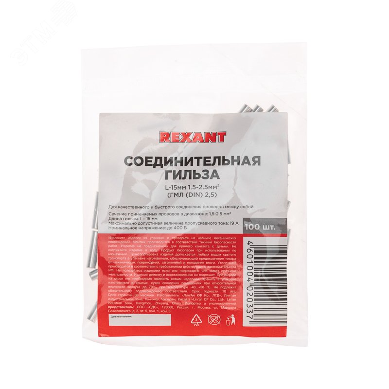 Соединительная гильза (СГ L-15 мм) 1.5-2.5 мм.кв. REXANT предназначена для качественного и быстрого соединения проводов между собой. Такая гильза используется для соединения многожильных медных проводов соответствующего диаметра при монтаже мобильных электрических контактных соединений на подвижном составе (автомобиле-, вагоно-, самолето- и судостроении) или в других местах, где важна надежность соединения (к примеру, радио- или климатическое оборудование). Соединительная гильза REXANT представляет собой цельнотянутую латунную трубку (контактная часть), с поверхностным электролитическим лужением, которая имеет посередине ограничительную высечку, для равномерного заведения проводов с обеих сторон. Обжатие производится путем механической деформации специальными пресс-клещами (ht-301 H, ht-301 N, ht-301 W) после заведения жил.