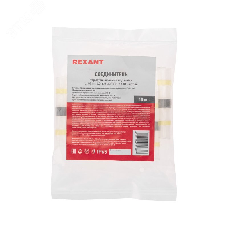 Соединитель термоусаживаемый под пайку REXANT предназначен для соединения медных многопроволочных проводов внахлест или встык методом термообработки. Нестандартный метод соединения проводов обусловлен особым конструктивным строением - для обеспечения визуального контроля процесса монтажа применяется прозрачный материал изоляции, в середине соединителя располагается гильза из низкотемпературного припоя оловянно-свинцовой группы, с обеих сторон на внутренней поверхности термоусаживаемой трубки располагаются клеевые полосы, обеспечивающие герметичность соединения после усадки. Для достижения наилучшего результата необходимо осуществлять прогрев кольца припоя равномерно со всех сторон до расплавления вокруг контактного соединения жил проводов.