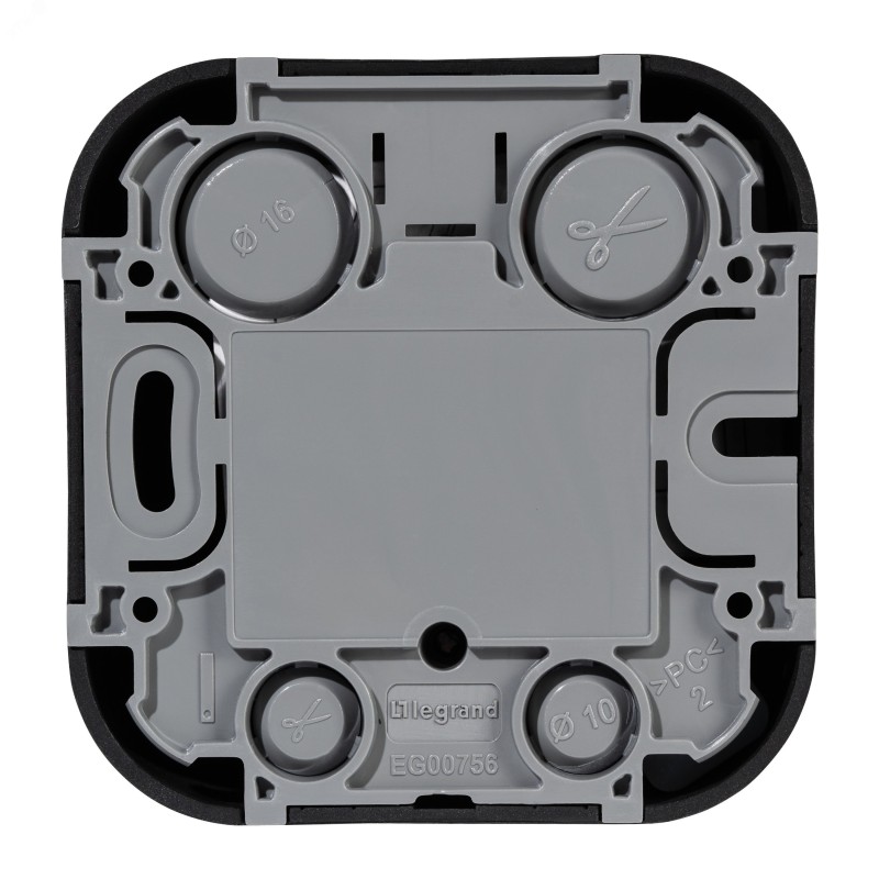 - Преимущества:Современный формат накладного монтажа|Механизм изготовлен из высококачественного поликарбоната, не проводит электрический ток, не поддерживает горение|Простое выравнивание изделий при установке в ряд, благодаря специальной форме основания|Корпус ударопрочный из пластичного полипропилена, стойкого к внешним воздействиям|Перфорация на корпусе для безошибочного вырезания отверстий при монтаже открытой проводки|В основании преднарезаны 4 отверстия для подвода кабеля при монтаже скрытой проводки