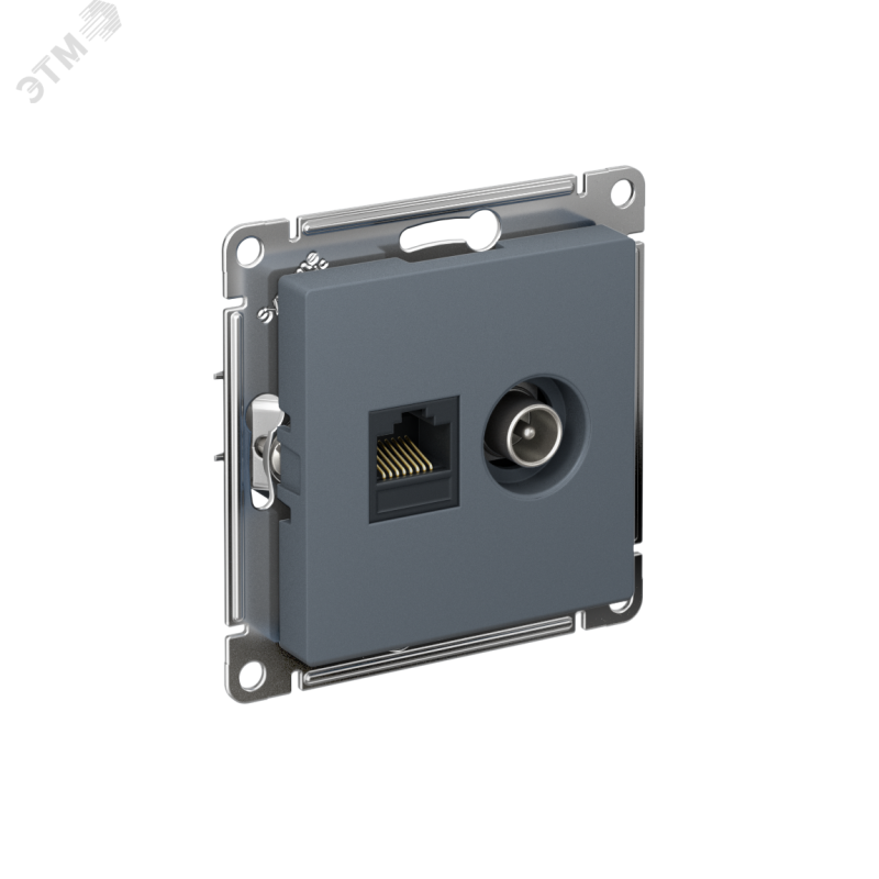 Механизм Systeme Electric (ранее Schneider Electric) серии AtlasDesign в цвете грифель двойной розетки разъёмами RJ45 категории 5е и TV предназначен для удобного и быстрого подключения вашего компьютера и телевизора к соответствующим сетям. Лицевые детали из качественного ABS-пластика, устойчивого к царапинам и УФ-излучению. Усиленные прямые монтажные лапки для лучшей фиксации механизма в монтажной коробке.