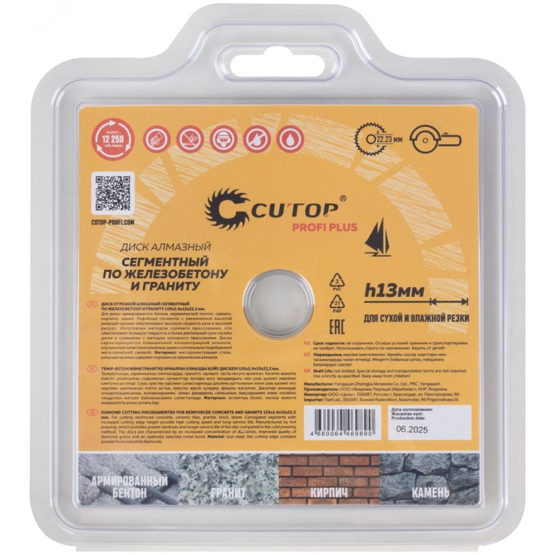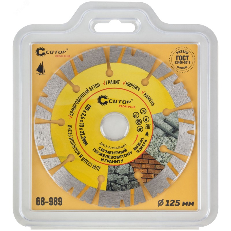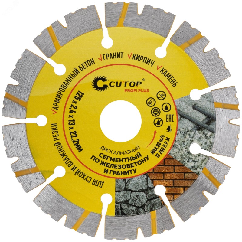 Для резки камня, кирпича, гранита, армированного бетона. Перфорация корпуса диска способствует дополнительному охлаждению. Изготовлен методом горячего прессования, что обеспечивает большую твердость и более длительный срок службы диска в сравнении с методом холодного прессования. Диски характеризуются повышенной концентрацией алмазов, улучшенным качеством алмазных зерен и оптимально подобранной металлической связкой. Эти преимущества обеспечивают высокую производительность и увеличенный срок службы. Материал - инструментальная сталь, режущая кромка содержит порошок из технических алмазов. Упаковка - блистер.
