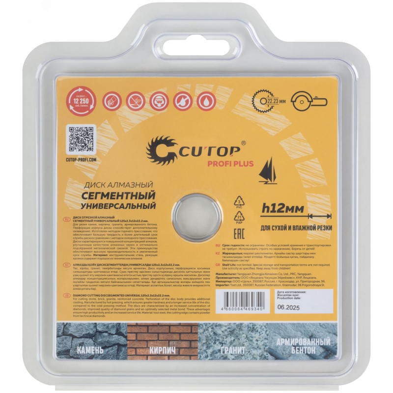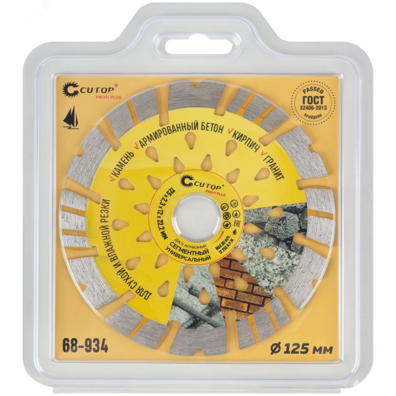 Для резки кирпича, гранита, армированного бетона, камня. Высокая скорость работы с твердыми материалами достигнута благодаря турбо-сегментной форме диска. Изготовлен методом горячего прессования, что обеспечивает большую твердость и более длительный срок службы диска в сравнении с методом холодного прессования. Диски характеризуются повышенной концентрацией алмазов, улучшенным качеством алмазных зерен и оптимально подобранной металлической связкой. Эти преимущества обеспечивают высокую производительность и увеличенный срок службы. Материал - инструментальная сталь, режущая кромка содержит порошок из технических алмазов. Упаковка - блистер.
