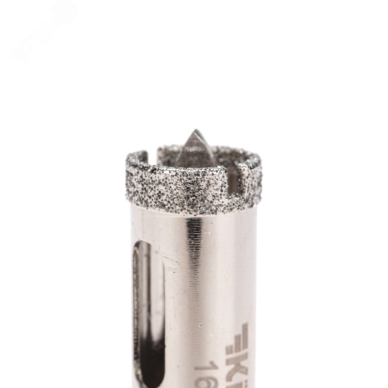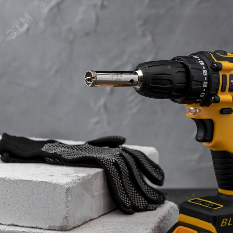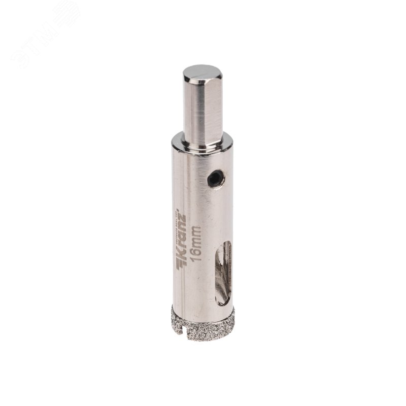 - Преимущества:Равномерное распределение алмазов по режущей кромке обеспечивает аккуратное сверление материала без трещин и сколов|Большой ресурс благодаря высокой статической и динамической прочности алмазов