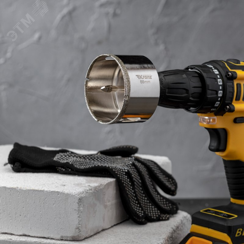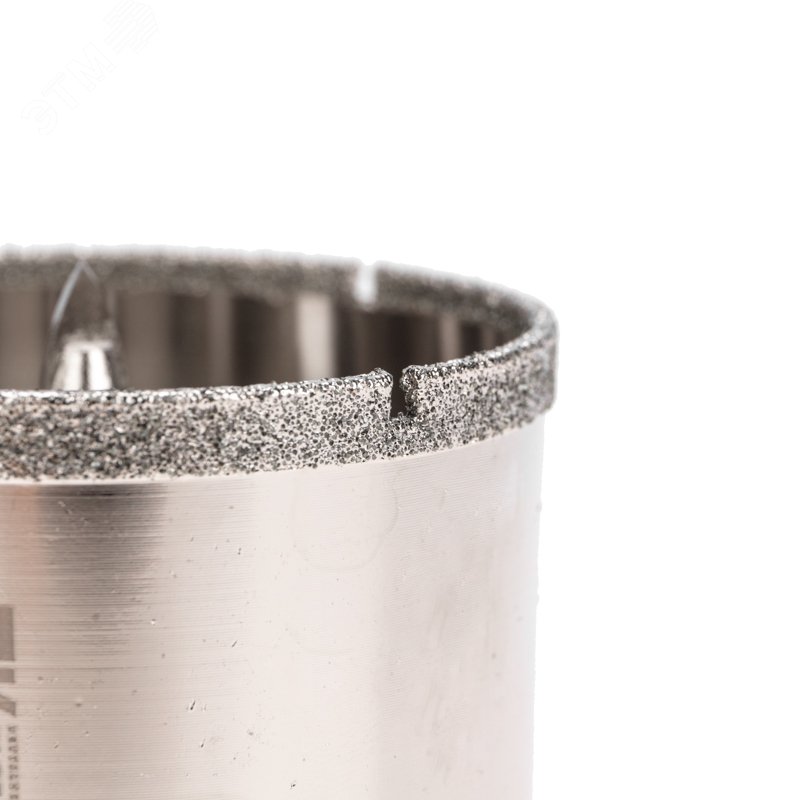 - Преимущества:Равномерное распределение алмазов по режущей кромке обеспечивает аккуратное сверление материала без трещин и сколов|Большой ресурс благодаря высокой статической и динамической прочности алмазов