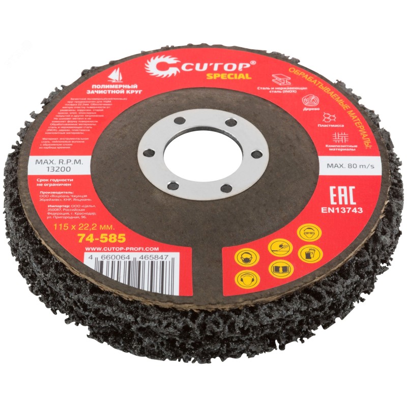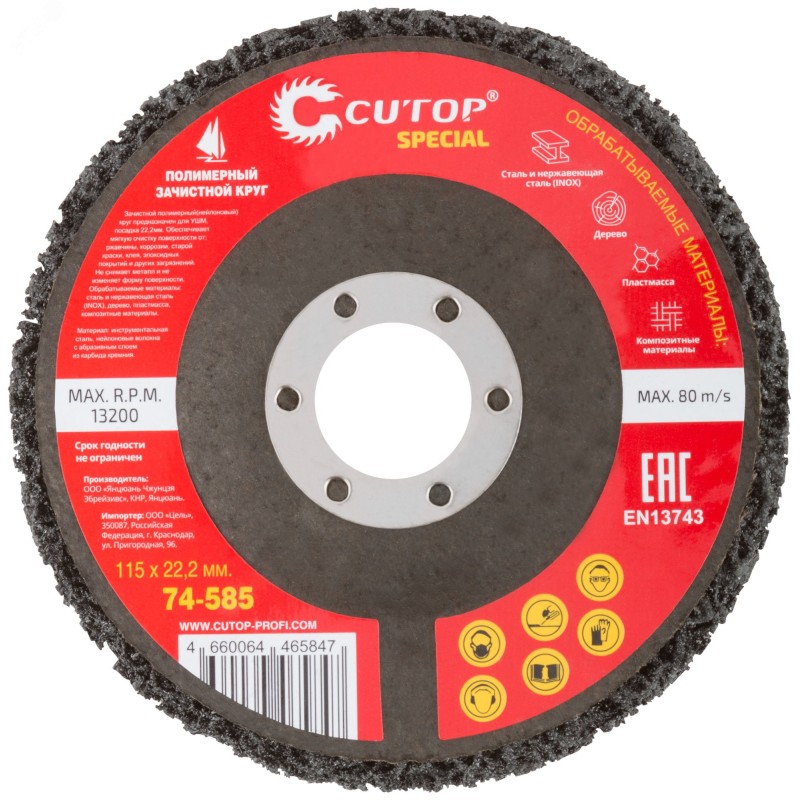 Зачистной полимерный(нейлоновый) круг предназначен для УШМ. Посадка 22,2 мм. Обеспечивает мягкую очистку поверхности от: Ржавчины, коррозии, старой краски, клея, эпоксидных покрытий и других загрязнений. Не снимает металл и не изменяет форму поверхности. Обрабатываемые материалы: сталь и нержавеющая сталь(INOX), дерево, пластмасса, композитные материалы. Материал: инструментальная сталь, нейлоновые волокна с абразивным слоем из карбида кремния.