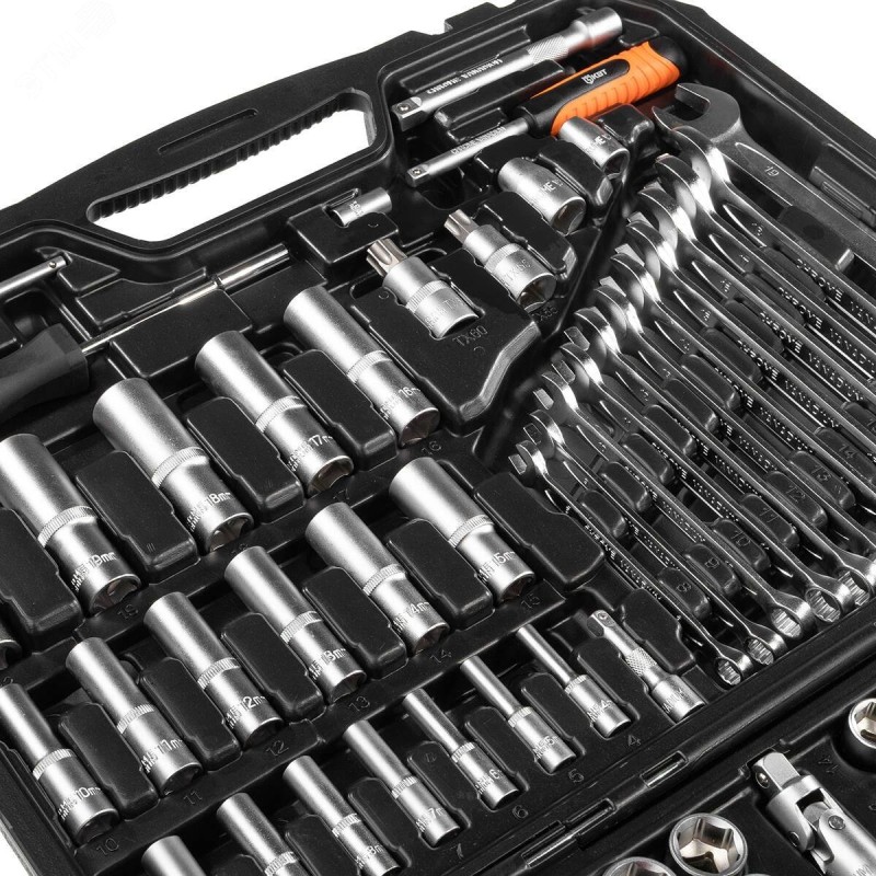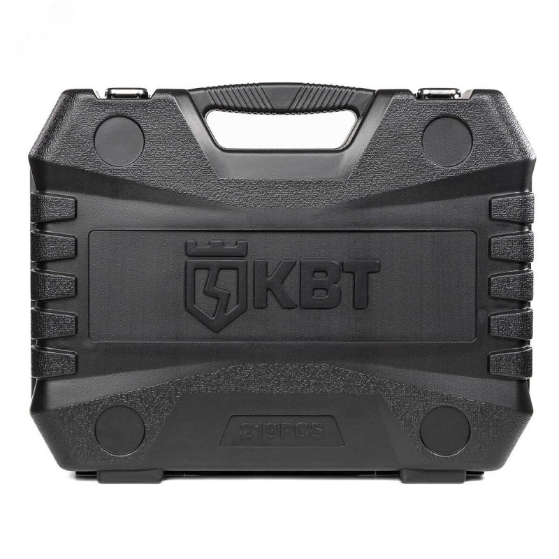 Набор инструмента из 219 предметов для проведения авторемонтных, слесарных и сантехнических работ. Отвертка-держатель со сменными битами – отвертка-держатель с внутренним присоединительным квадратом 1/4'' в рукоятке. Биты 30 мм – SL – 6, 6.5, 8, PH – 3, 4, PZ – 3, 4, ТORX – 25, 27 (2 шт.), 30 (2 шт.), 35 (2 шт.), 40 (3 шт.), 45 (2 шт.), 50 (2 шт.), HEX – 5.5, 6 (2 шт.), 7, 8, М – 5, 6, 8, 10, биты 25 мм – SL – 4 (2 шт.), 5, 5.5, 6, 8, PH – 1, 2, PZ – 1, 2, ТORX – 8, 10, 15, 20, 25, ТORX (с отверстием) – 8, 10 (2 шт.) , 15, 20 (3 шт.), 25 (2 шт.), 40, HEX – 3, 4, 5, 6 мм, HEX (c отверстием) – 3, 4, 5, 6 мм, М – 5, 6, 8, S – 1, 2, TORQ – 6, 8, 10, TRI-WING – 1, 2, 3. Материал торцевых головок – хром-ванадиевая сталь. Покрытие – матовое никелирование.