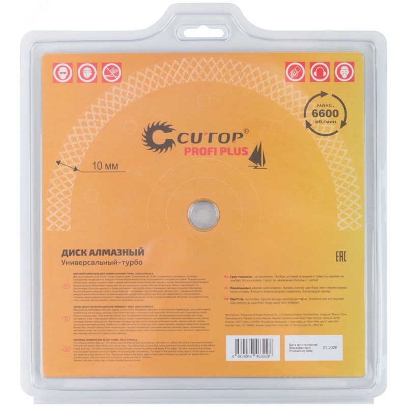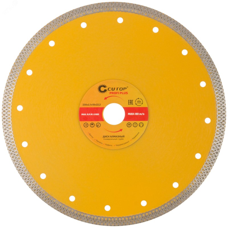 Для резки керамической плитки. Сухая, влажная резка. Применяется на УШМ и стационарных плиткорезах для резки с охлаждением керамогранита, твердой и мягкой керамической плитки, искусственного и натурального камня. Режущая кромка обеспечивает высокую скорость резки и аккуратный точный распил плитки без трещин и сколов. Высокая концентрация алмазов мелкой фракции обеспечивает идеальную чистоту получаемых кромок. Изготовлен методом горячего прессования, что обеспечивает большую твердость и более длительный срок службы диска в сравнении с методом холодного прессования. Высота алмазного режущего слоя в 10 мм позволяет использовать круг для большого объема работ. Специальная форма режущей кромки обеспечивает лучшее охлаждение круга во время работы для большей эффективности использования. Усиление диска в районе посадочного отверстия для повышения жесткости и снижения вибраций.