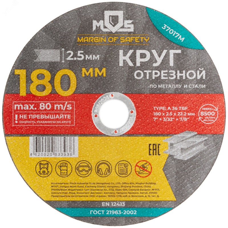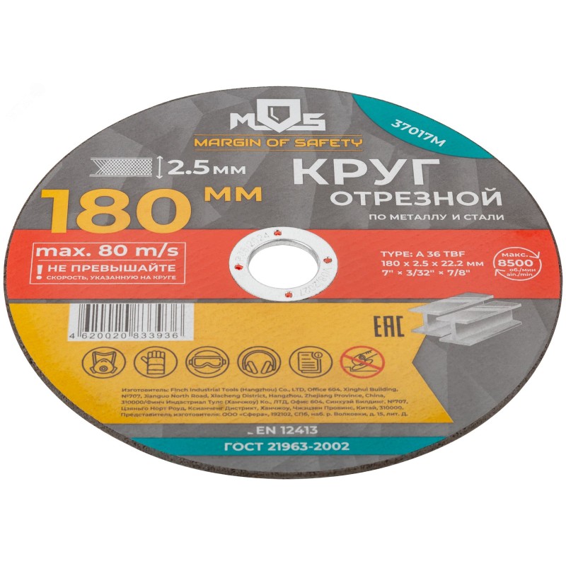 Круг отрезной по металлу MOS, посадочный диаметр 22,2 мм, 180х2,5 мм