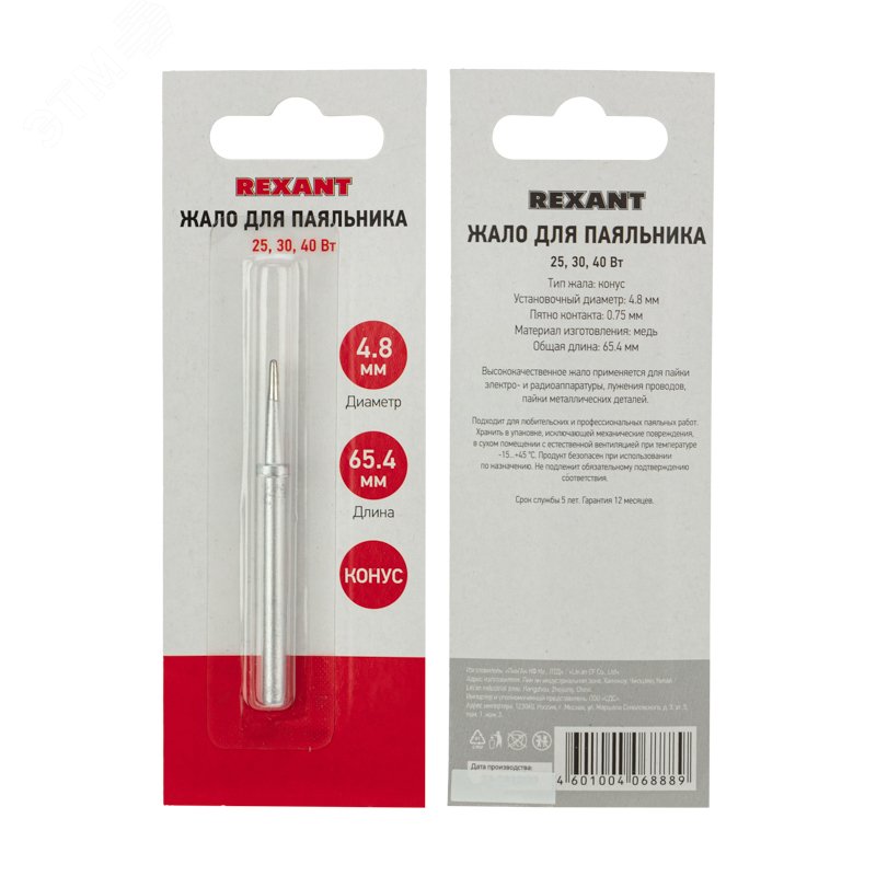 Жало для паяльников мощностью 25, 30 и 40 Вт REXANT представляет собой долговечное жало, состоящее из медного сердечника, покрытого слоем электролитически осажденного железа. Рабочая часть жала электрохимически покрыта слоем олова (что обеспечивает облуживаемость), а остальная поверхность — хромирована. Такие жала могут при соблюдении ряда предосторожностей работать длительное время без разрушения. Сменное коническое паяльное жало предназначено для точной пайки компонентов. Тип жала - конус. Установочный диаметр - 4.8 мм. Пятно контакта - 0.75 мм. Общая длина - 65.4 мм. Материал изготовления - медь.