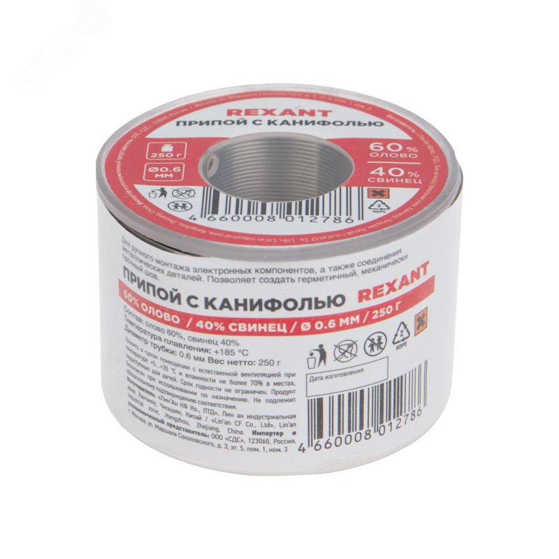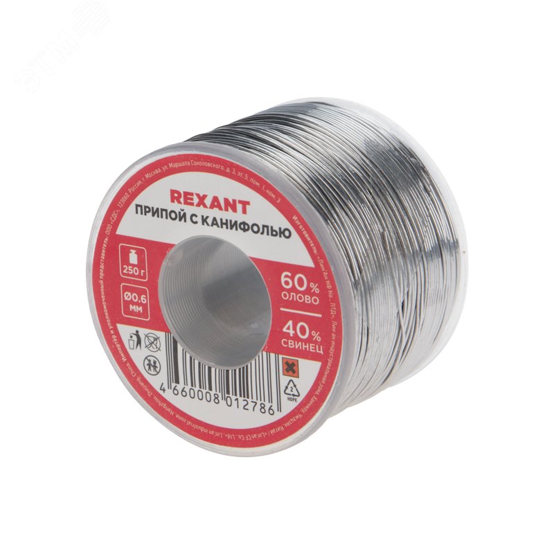 Припой с канифолью REXANT представляет собой проволоку (диаметром 0,6 мм) из сплава олова (60 %) и свинца (40 %). Используется в пайке для соединения деталей между собой и позволяет создать герметичный, механически прочный (устойчивый) шов. Нагреваясь до температуры плавления (183...188 градусов) припой расплавляется, смачивает спаиваемый металл и, растекаясь по нему, заполняет место между соединяемыми деталями. В свою очередь флюс канифольный активный (MC-20A) помогает сделать паянное соединение более прочным, убирая окислительную плёнку со спаиваемых поверхностей и защищая их от дальнейшего окисления при пайке.