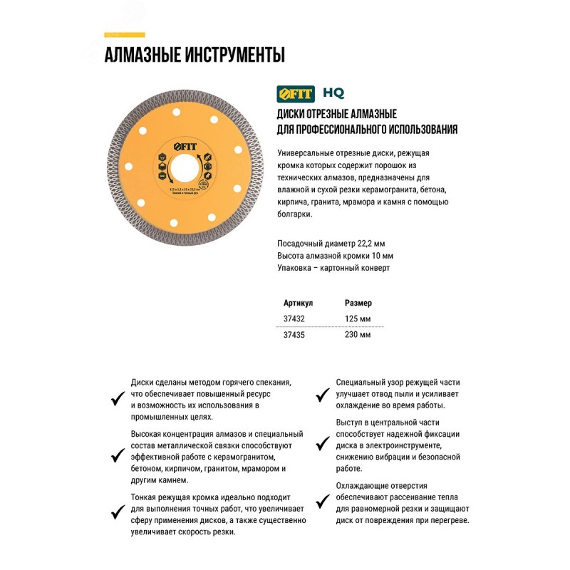 - Преимущества:Диск обладает универсальностью применения с возможностью работы без принудительного охлаждения|Усиление центральной части повышает прочность диска и стабильность реза|Тонкая режущая кромка способствует чистому резу без сколов с минимальным удалением материала|Технология горячего спекания и повышенная концентрация алмазов повышают прочность диска и его износостойкость|Х-образная режущая кромка обеспечивает эффективное охлаждение и минимизирует боковое трение|Высокая режущая кромка способствует увеличенному ресурсу