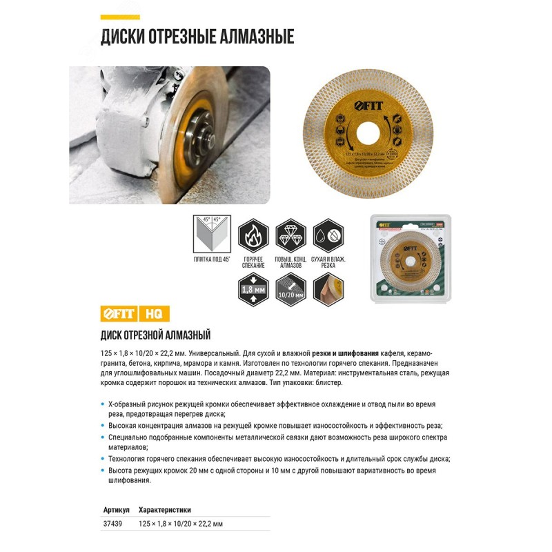 Для углошлифовальных машин. Для профессионального использования. Сделан по технологии горячего спекания, что увеличивает срок службы и позволяет использовать диск в профессиональных целях. Для сухой и влажной резки и шлифования кафеля, керамогранита, бетона, кирпича, гранита, мрамора и камня. Высота режущей кромки 10 мм с одной стороны и 20 мм с другой стороны для большей вариативности при шлифовании.