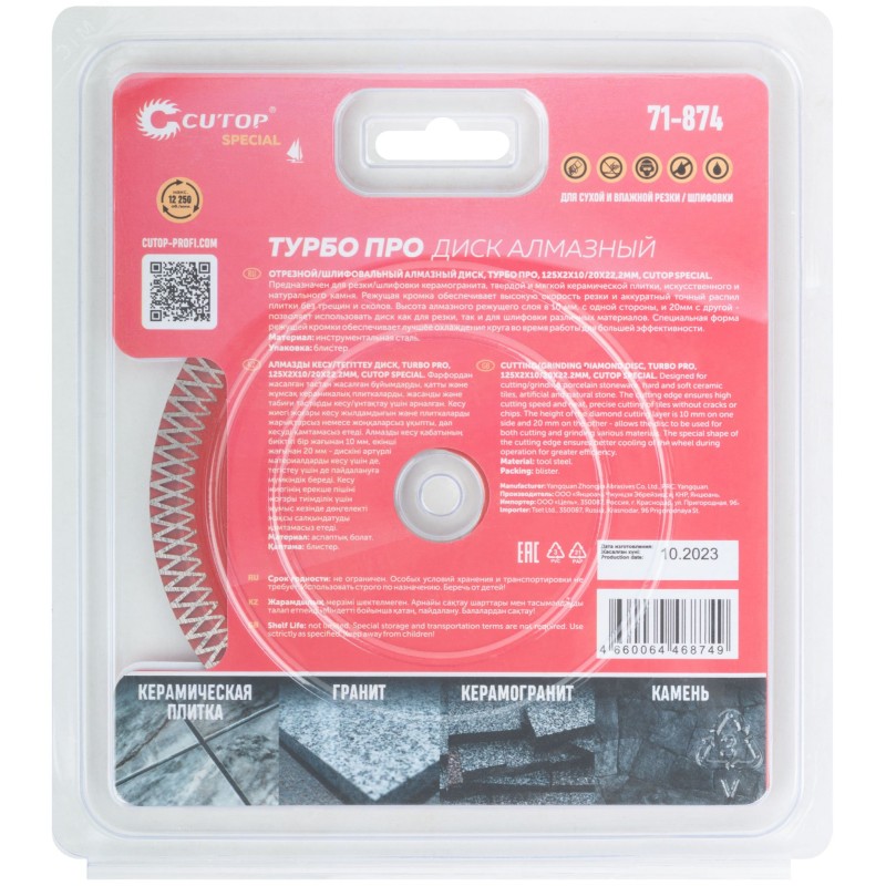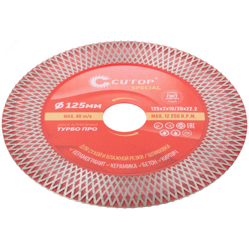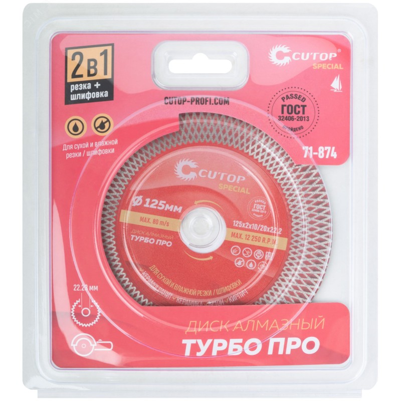 Предназначен для резки/шлифовки керамогранита, твердой и мягкой керамической плитки, искусственного и натурального камня. Режущая кромка обеспечивает высокую скорость резки и аккуратный точный распил плитки без трещин и сколов. Высота алмазного режущего слоя в 10 мм, с одной стороны, и 20мм с другой - позволяет использовать диск как для резки, так и для шлифовки различных материалов. Специальная форма режущей кромки обеспечивает лучшее охлаждение круга во время работы для большей эффективности. Материал – инструментальная сталь, высокотехнологичные синтетические алмазы. Упаковка – блистер.
