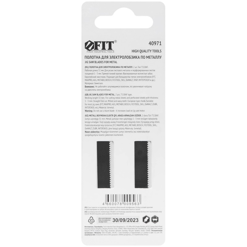 Полотна для электролобзика по металлу FIT HQ предназначены для резки листового металла, перфорированных листов. Прямой тонкий пропил. Зубья профрезированные, ''волна''. Зубья изготовлены из быстрорежущей стали (HSS) Р6М5 и имеют улучшенную стойкость к истиранию. Основа изготовлена из хром-ванадиевой стали и обладает высокой прочностью, термостойкостью и стойкостью к коррозии. Т-образный хвостовик европейского типа совместим с большинством моделей электролобзиков.