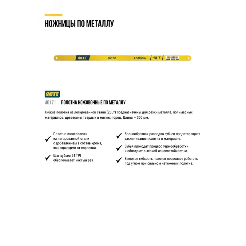- Преимущества:Волнообразная развода зубьев предотвращает заклинивание полотна|Шаг зубьев 24 tpi обеспечивает высокую скорость реза|Зубья с дополнительной термообработкой обладают высокой стойкостью к разрушению и длительным сроком службы|Гибкость полотен позволяет резать заготовки под углом при сильном натяжении|Покраска полотен предотвращает коррозию
