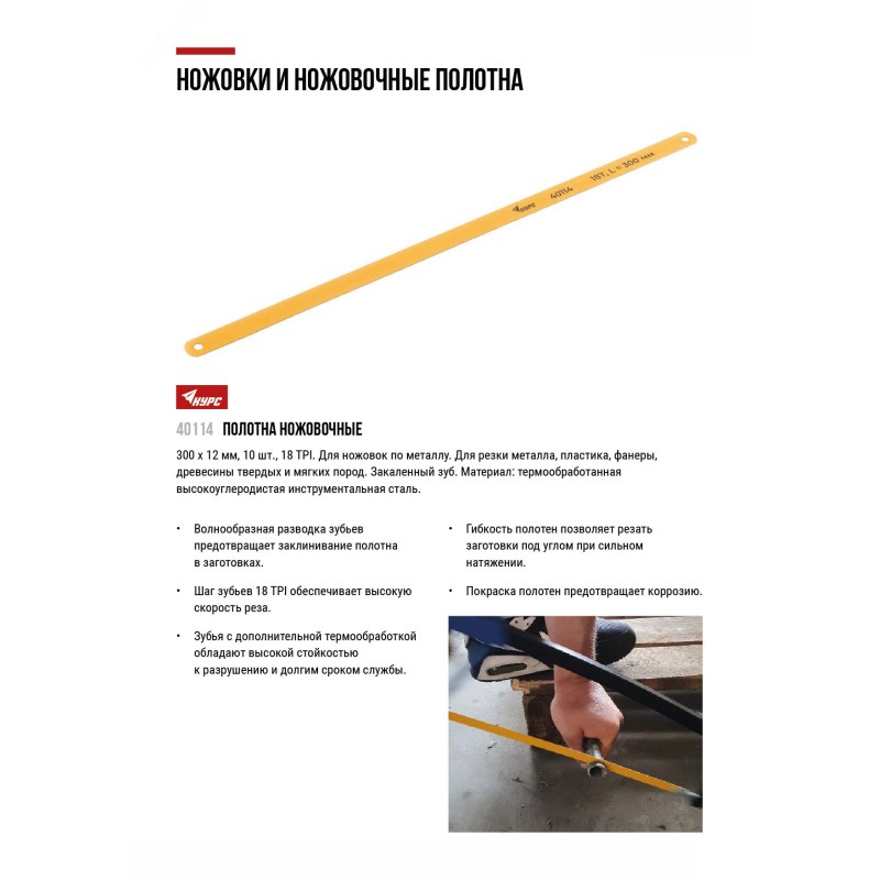 - Преимущества:Волнообразная развода зубьев предотвращает заклинивание полотна|Шаг зубьев 18 tpi обеспечивает высокую скорость реза|Зубья с дополнительной термообработкой обладают высокой стойкостью к разрушению и длительным сроком службы|Гибкость полотен позволяет резать заготовки под углом при сильном натяжении|Покраска полотен предотвращает коррозию