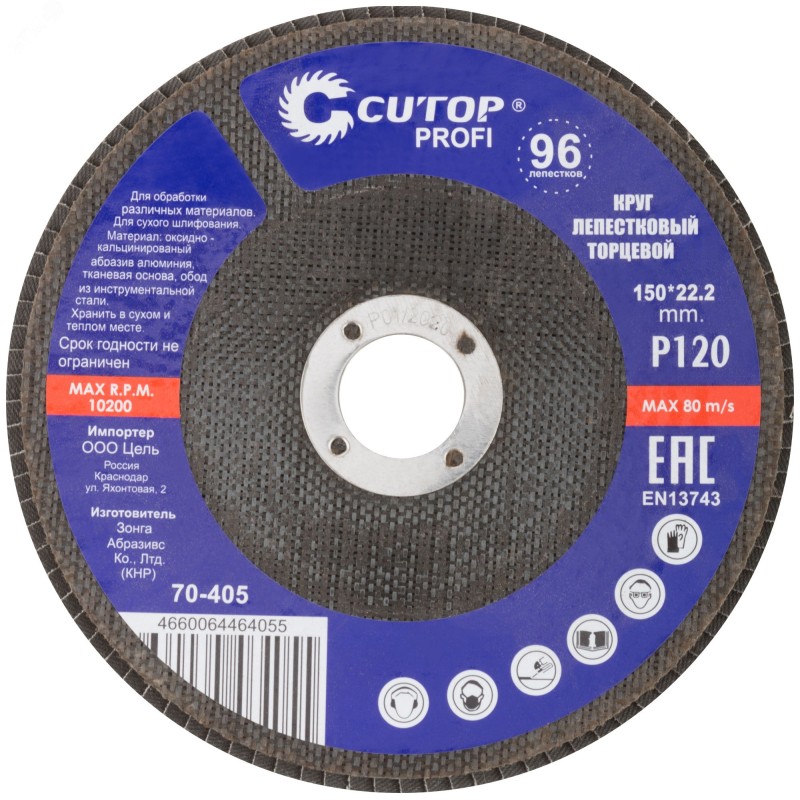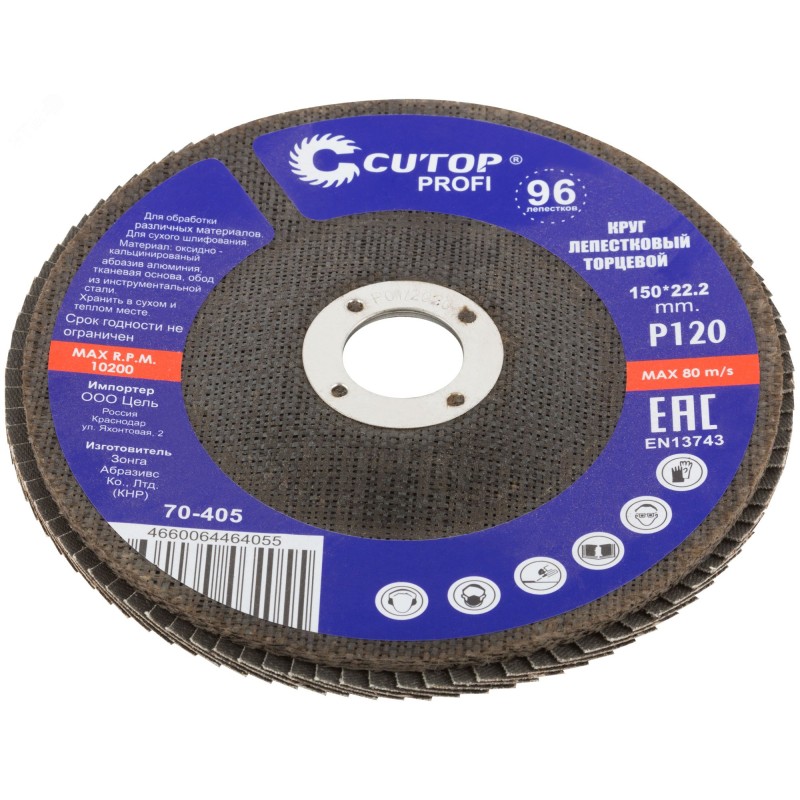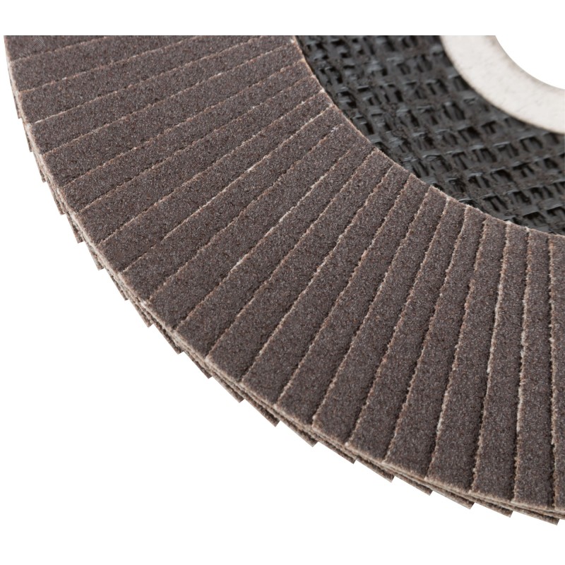 При изготовлении используется высококачественный гибкий абразивный материал состоящий из тканевой основы на которую нанесен слой кальцинированного оксида алюминия. Данный абразив имеет более твердые частицы, чем обычный оксид алюминия - Корунд, что позволяет увеличить скорость обрабатываемой поверхности до пяти раз. Наполняемость диска составляет до 96 лепестков с углом наклона 10 градусов, что позволяет увеличить КПД круга и его стойкость к износу в несколько раз. Предназначен для обработки металла и нержавеющей стали. Для углошлифовальных машин. Посадочный диаметр 22,2 мм.