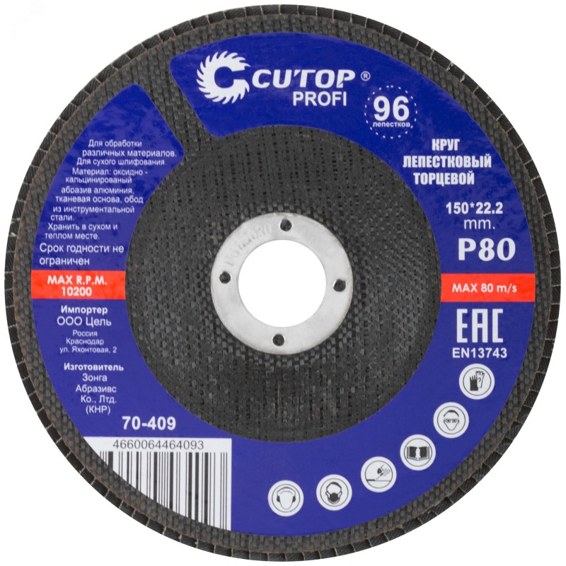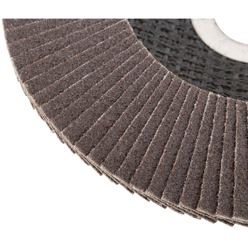 При изготовлении используется высококачественный гибкий абразивный материал состоящий из тканевой основы на которую нанесен слой кальцинированного оксида алюминия. Данный абразив имеет более твердые частицы, чем обычный оксид алюминия - Корунд, что позволяет увеличить скорость обрабатываемой поверхности до пяти раз. Наполняемость диска составляет до 96 лепестков с углом наклона 10 градусов, что позволяет увеличить КПД круга и его стойкость к износу в несколько раз. Предназначен для обработки металла и нержавеющей стали. Для углошлифовальных машин. Посадочный диаметр 22,2 мм.