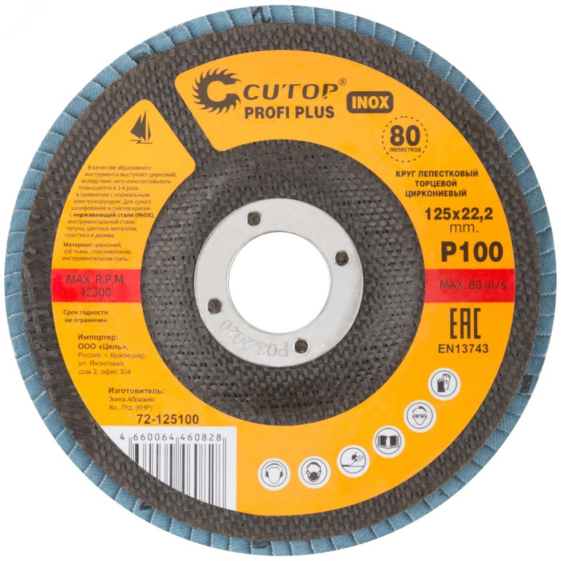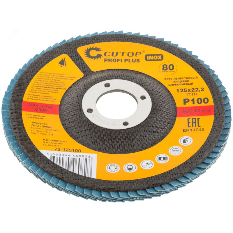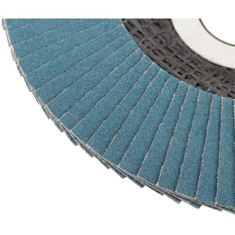 При изготовлении используется высококачественный гибкий абразивный материал состоящий из тканевой основы на которую нанесен слой циркониевого электрокорунда. Круги на основе циркониевого электрокорунда имеют высокую прочность, коэффициент шлифования на кругах данного типа выше в несколько раз, чем у кругов на основе нормального электрокорунда, что особенно эффективно при работе с особо твердыми сортами металла. Структура циркониевого электрокорунда дает эффект самозатачивания, что также увеличивает ресурс использования. Наполняемость диска составляет 80 лепестков с углом наклона 10 градусов, это позволяет увеличить КПД круга и его стойкость к износу в несколько раз. Предназначен для обработки нержавеющей стали, металла, сварных швов, пластика, дерева. Для углошлифовальных машин. Посадочный диаметр 22,2 мм.
