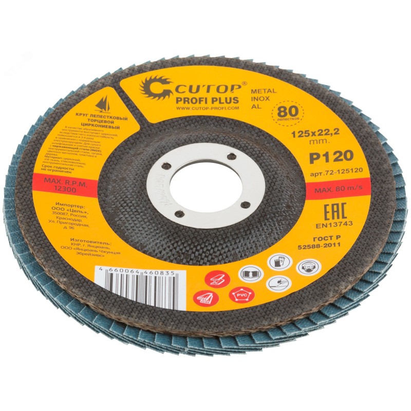 При изготовлении используется высококачественный гибкий абразивный материал состоящий из тканевой основы на которую нанесен слой циркониевого электрокорунда. Круги на основе циркониевого электрокорунда имеют высокую прочность, коэффициент шлифования на кругах данного типа выше в несколько раз, чем у кругов на основе нормального электрокорунда, что особенно эффективно при работе с особо твердыми сортами металла. Структура циркониевого электрокорунда дает эффект самозатачивания, что также увеличивает ресурс использования. Наполняемость диска составляет 80 лепестков с углом наклона 10 градусов, это позволяет увеличить КПД круга и его стойкость к износу в несколько раз. Предназначен для обработки нержавеющей стали, металла, сварных швов, пластика, дерева. Для углошлифовальных машин. Посадочный диаметр 22,2 мм.