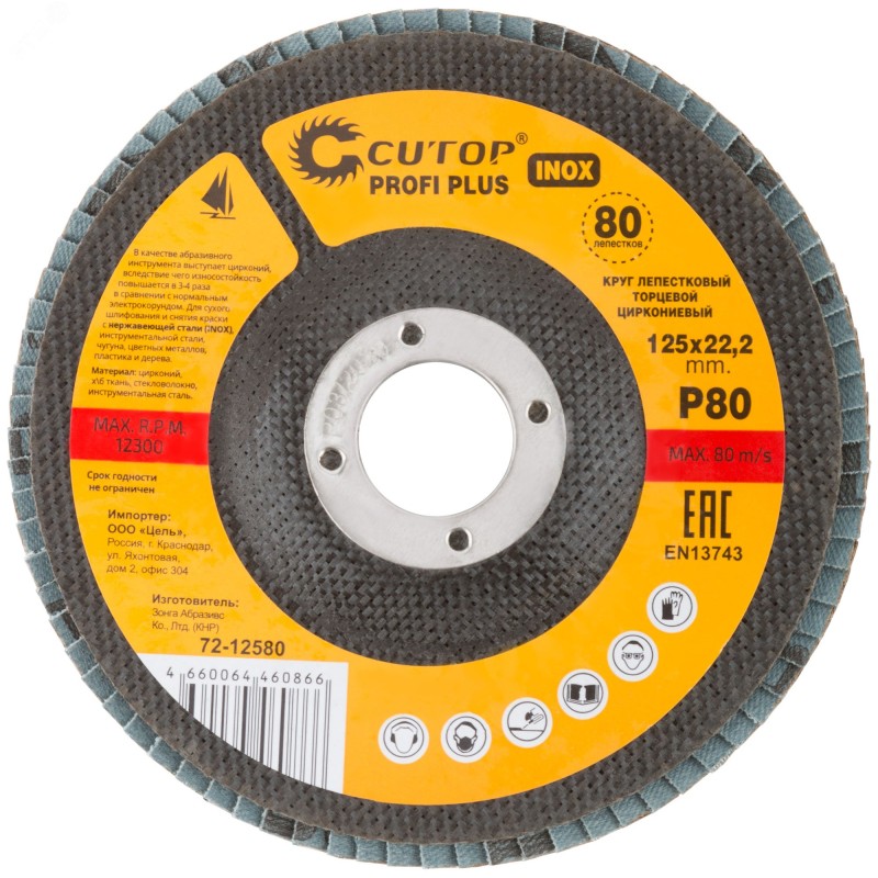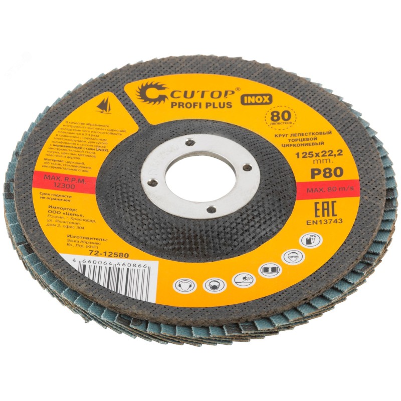 Круг наждачный лепестковый Cutop Profi Plus предназначен для обработки нержавеющей стали, металла, сварных швов, пластика, дерева. Для углошлифовальных машин. При изготовлении кругов используется высококачественный гибкий абразивный материал, состоящий из тканевой основы, на которую нанесен слой циркониевого электрокорунда. Круги на основе циркониевого электрокорунда имеют высокую прочность, коэффициент шлифования на кругах данного типа выше в несколько раз, чем у кругов на основе нормального электрокорунда, что особенно эффективно при работе с особо твёрдыми сортами металла. Структура циркониевого электрокорунда даёт эффект самозатачивания, что также увеличивает ресурс использования. Наполняемость диска составляет 80 лепестков с углом наклона 10 градусов, это позволяет увеличить КПД круга и его стойкость к износу в несколько раз.