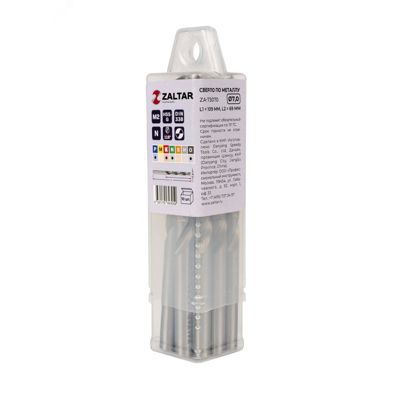- Дополнительная информация:количество в наборе, шт - 10|технический стандарт - DIN 338|материал - HSS-G|тип сверла - N|диаметр сверла, мм - 7.0|рабочая длина, мм - 69|длина, мм - 109|глубина реза - 5xD|угол заточки - 118 градусов|угол спирали - 25-30 градусов|тип хвостовика - цилиндрический|тип заточки - DIN1412-C - крестообразная подточка перемычки