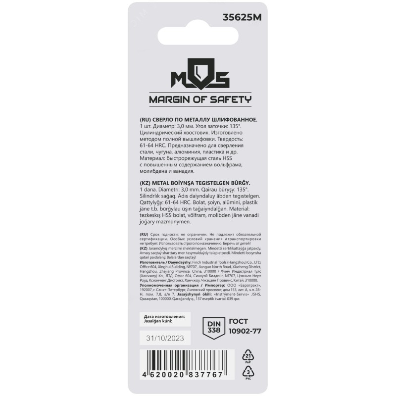 - Тип изделия:Сверло по металлу